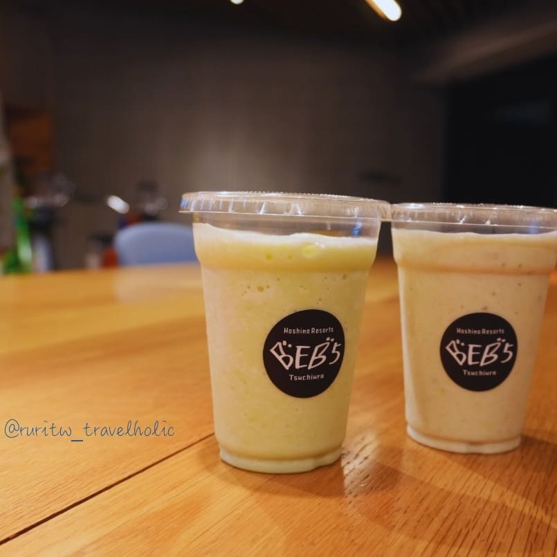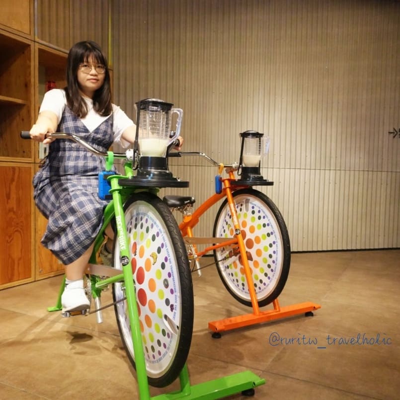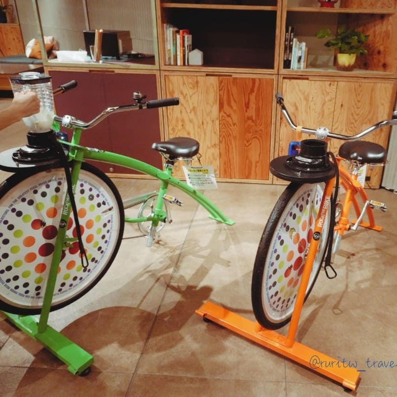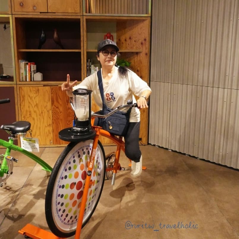 第二天早上的早餐是飯店與鄰近商店合作的餐點,我選擇了位於車站 2 樓的麵包店 COURNNE BAKERY 推出的有土浦在地食材做成的鹹香腸麵包套餐。早餐結束回到飯店,我們使用了思慕昔兌換券,換了水果思慕昔。水果思慕昔的製作方式很特別,工作人員會準備好原料,裝在大廳裡兩台我原本以為是裝飾的腳踏車上,接著讓我們像踩飛輪的方式踩 30 秒,一杯靠自己的腳力踩出來的思慕昔就完成了。