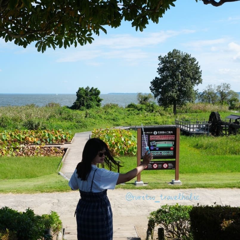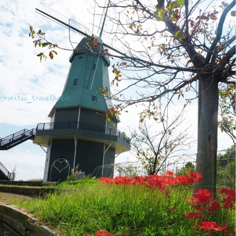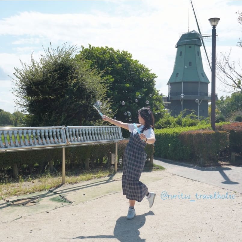 退房完我跟媽媽徒步去「霞浦綜合公園」,沿著河川散步拍照,其實也差不多 40 分鐘就到了。霞浦公園最著名的地標是風車,搭配季節交替盛開的彼岸花,青綠的風車與豔紅的花朵,形成強烈色彩對比。就我的觀察,公園內春末有紫藤、盛夏有荷花、初秋有彼岸,每一個季節都有不同風情。值得一提的是,剛好附近的服務中心賣泡泡水,我買了泡泡水跟媽媽玩得不亦樂乎。