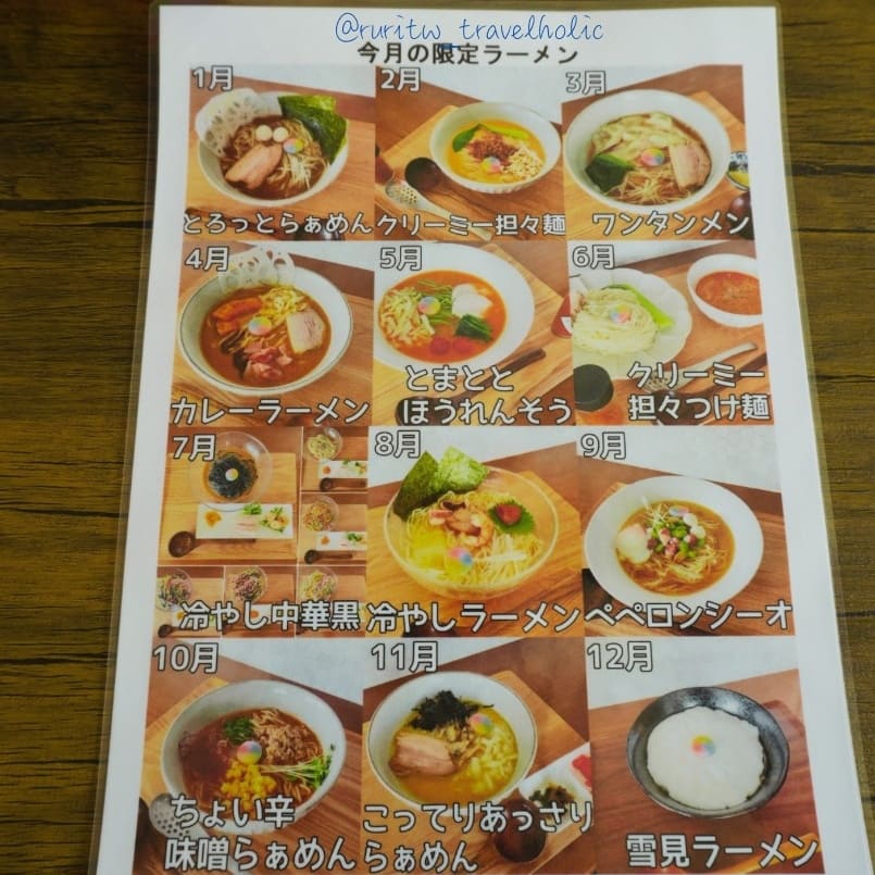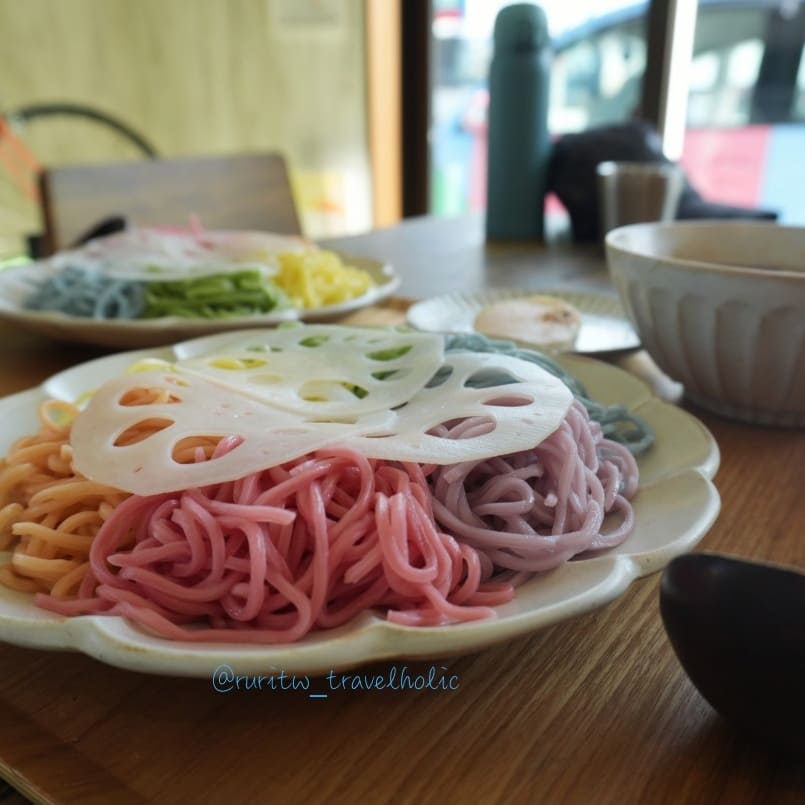 橫跨了霞浦公園的綠地,來到一間拉麵店吃午餐。這是一間很有特色的拉麵店,外面停放著一輛六色烤漆的金龜車。老闆對於色彩著迷,生活用品舉凡汽車、單車,或是其他裝飾品,皆是六種顏色,店內更是擺放著色彩檢定的證書。每個月會推出限定菜單,不過我覺得最有特色的還是用六種食材做成的六色沾麵,紅色甜菜根、橙色番茄、黃色南瓜、綠色菠菜、藍色蝶豆花,是對身體很好的蔬菜。老闆夫婦都是很親切的人,知道我們從臺灣來,說他們很喜歡臺灣也有去臺灣騎腳踏車。