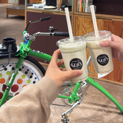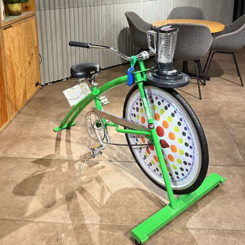 吃完早餐和買完伴手禮後,我們再次回到「BEB5土浦 by 星野リゾート」,飯店提供了多款桌遊可以自由拿取,最特別的還有以踩腳踏車當作動力製作的果昔,有香蕉、草莓和哈密瓜三種口味,我們分別選了香蕉和哈密瓜,計時30秒用盡全力踩,馬上就能現得到一杯現打的新鮮果昔,真的好喝又好玩。飯店同時也提供了腳踏車租借服務,櫃台人員會詳細介紹路線和推薦景點,可以放心租到適合的腳踏車。