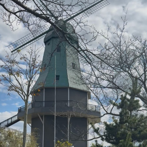 推薦有機會來土浦的話一定要體驗騎腳踏車!我們的第一站是「霞ヶ浦総合公園」。從飯店出發沿著湖邊騎行,微風迎面吹來,天氣晴朗,整段路都能欣賞到霞浦湖的開闊景色。公園內的荷蘭型風車前還有「光の輪のむこうに」雕塑,許多騎腳踏車經過的人都會特地停下來拍照打卡,將風車與湖景一起收進畫面中,是土浦最具代表性的景點之一。