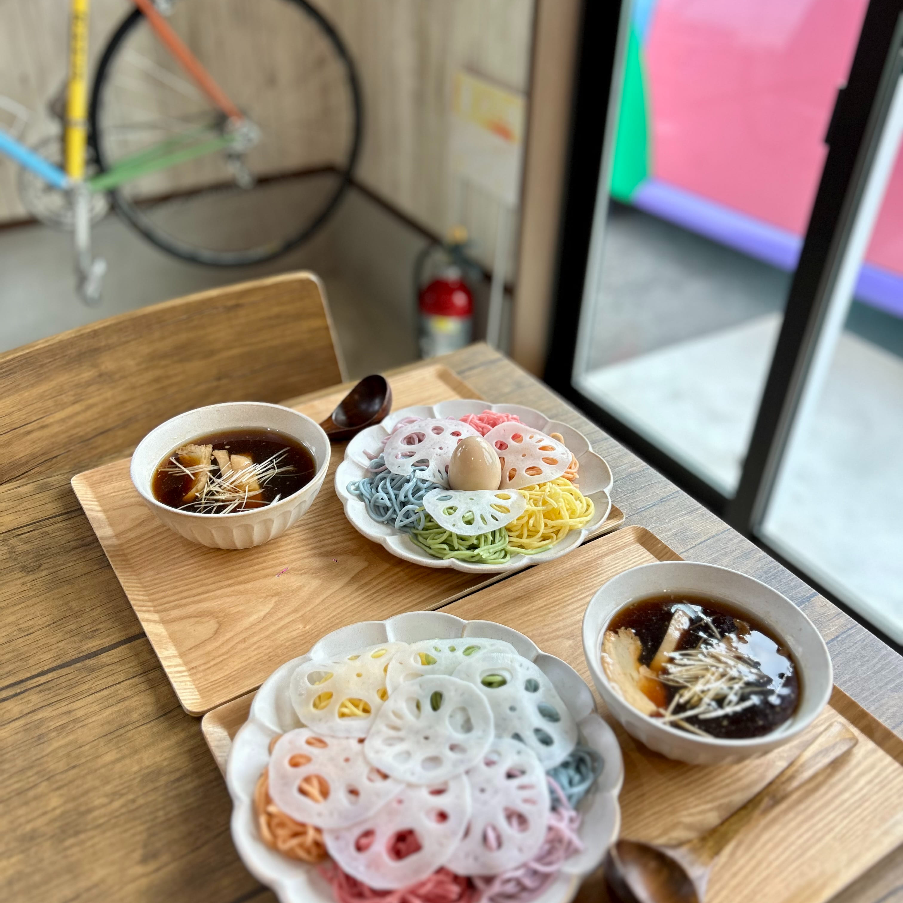 不知道要開咖啡廳還是拉麵店(? 店名就像老闆娘掙扎後的結果。只營業中午。 主打非常漂亮的 六彩沾麵,上面有三片蓮藕薄片,清爽得很像在吃藝術品。 外頭的小轎車跟店內的兩台公路車也都是五彩繽紛的模樣🌈 是很開朗的夫婦經營的可愛拉麵小店! 沾麵吃完,可以跟老闆娘說想加高湯!