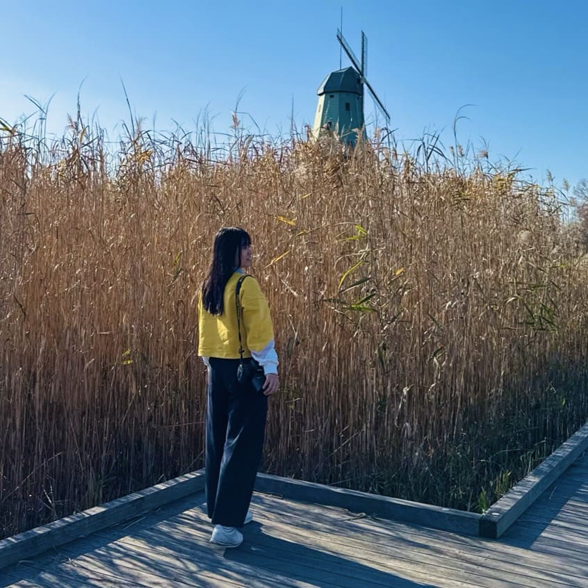 吃飽後騎回剛才經過的霞ヶ浦総合公園,這裡的巨大風車是土浦的地標。也可以登上風車展望風景,可能因為茨城機場的關係,還可以拍到飛機和風車同框的場景喔!除了風車,附近往湖邊走的步道剛好一片芒草,也很適合擺拍打卡。當天很幸運在公園另一邊還有一排染紅的小樹林,剛好抓住秋末最後的紅葉。 ※腳踏車停車位:風車前的停車場。 離開時沿著霞ヶ浦騎著腳踏車欣賞靜謐的湖景,彷彿被大自然療癒一般,讓人整個都放鬆下來