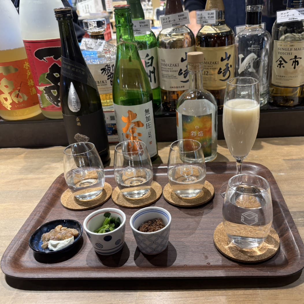 晚上想小酌一下土浦在地清酒,所以走進了車站直結商場 「プレイアトレ土浦」 裡的 「佐藤酒店」。這是一家在茨城各地都有分店的在地清酒專賣店。傳承到第四代的年輕店主決定不再只賣酒,於是選擇進駐車站商場,以販售試飲套餐搭配下酒菜的形式,讓客人能透過品酒選購喜歡的款式。在店主的推薦下,我們品嘗了紀念土浦煙火大會百周年的清酒和甘酒,都是濃厚系偏甘口的風味。如果不確定想喝什麼,也可以直接和店主諮詢喔!