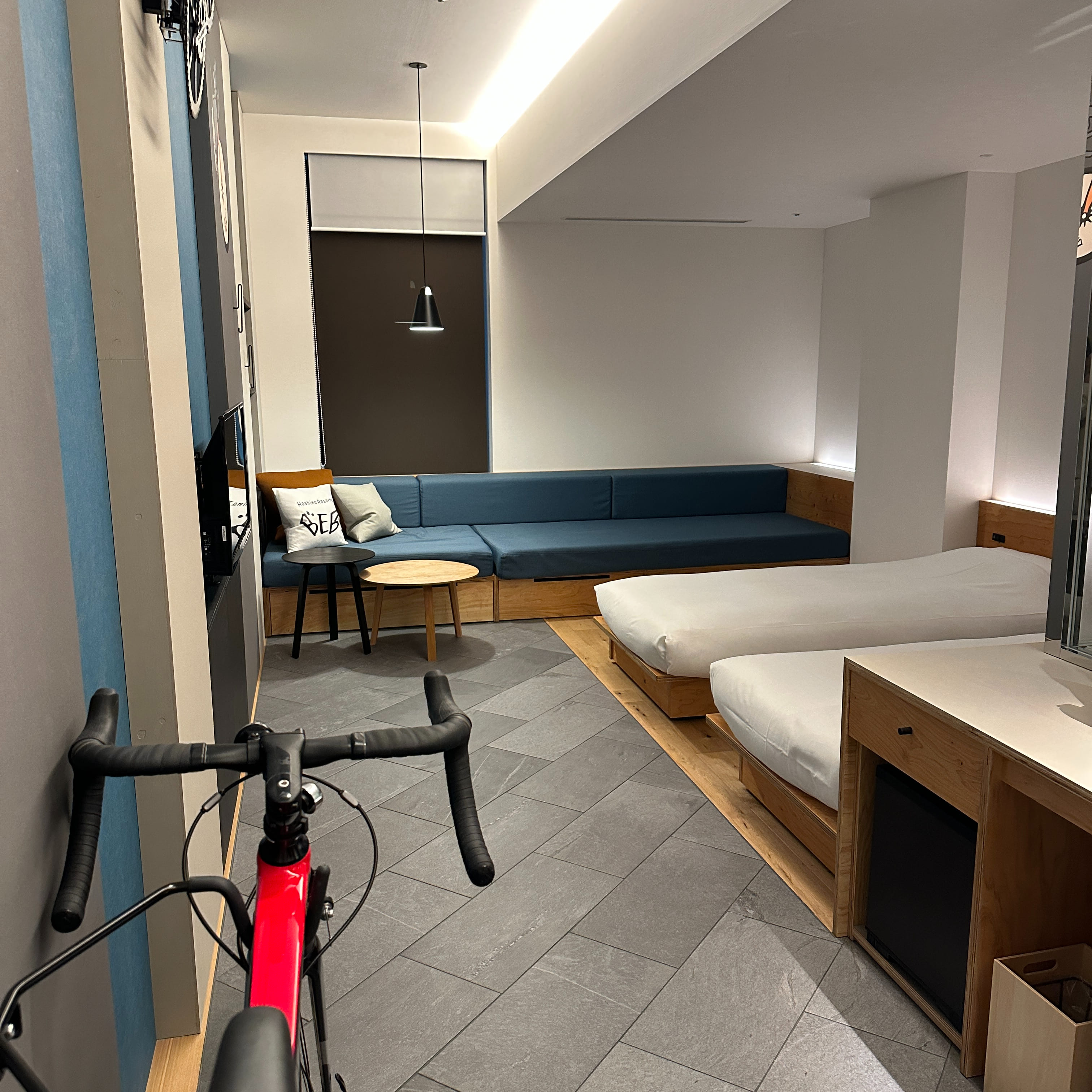回到星野 BEB5 歸還腳踏車並辦理 check-in。 一走進房間立刻讓我眼睛一亮,竟然是以「單車」為主題設計的房型,風格鮮明又有特色,而且空間真的非常寬敞,完全不會有壓迫感。房內還設有浴缸,可以好好泡澡放鬆一整天騎車的疲勞。就連拖鞋也很講究,是皮革質感設計,細節處都能感受到用心。 飯店公共空間還提供現打果汁可以點,我選了哈密瓜果汁,最有趣的是必須自己動手製作──透過「騎腳踏車」來驅動果汁機,真的有趣又好玩。