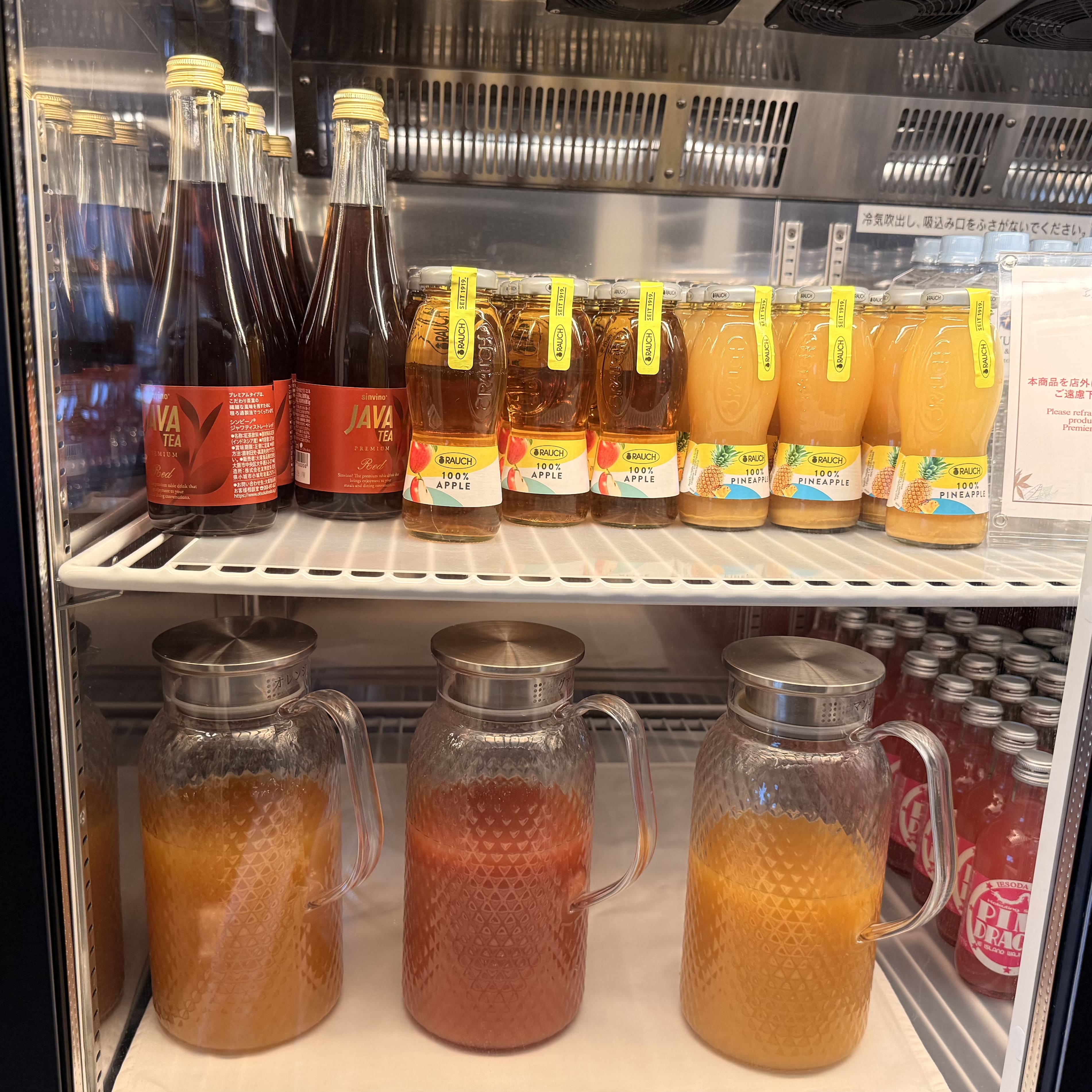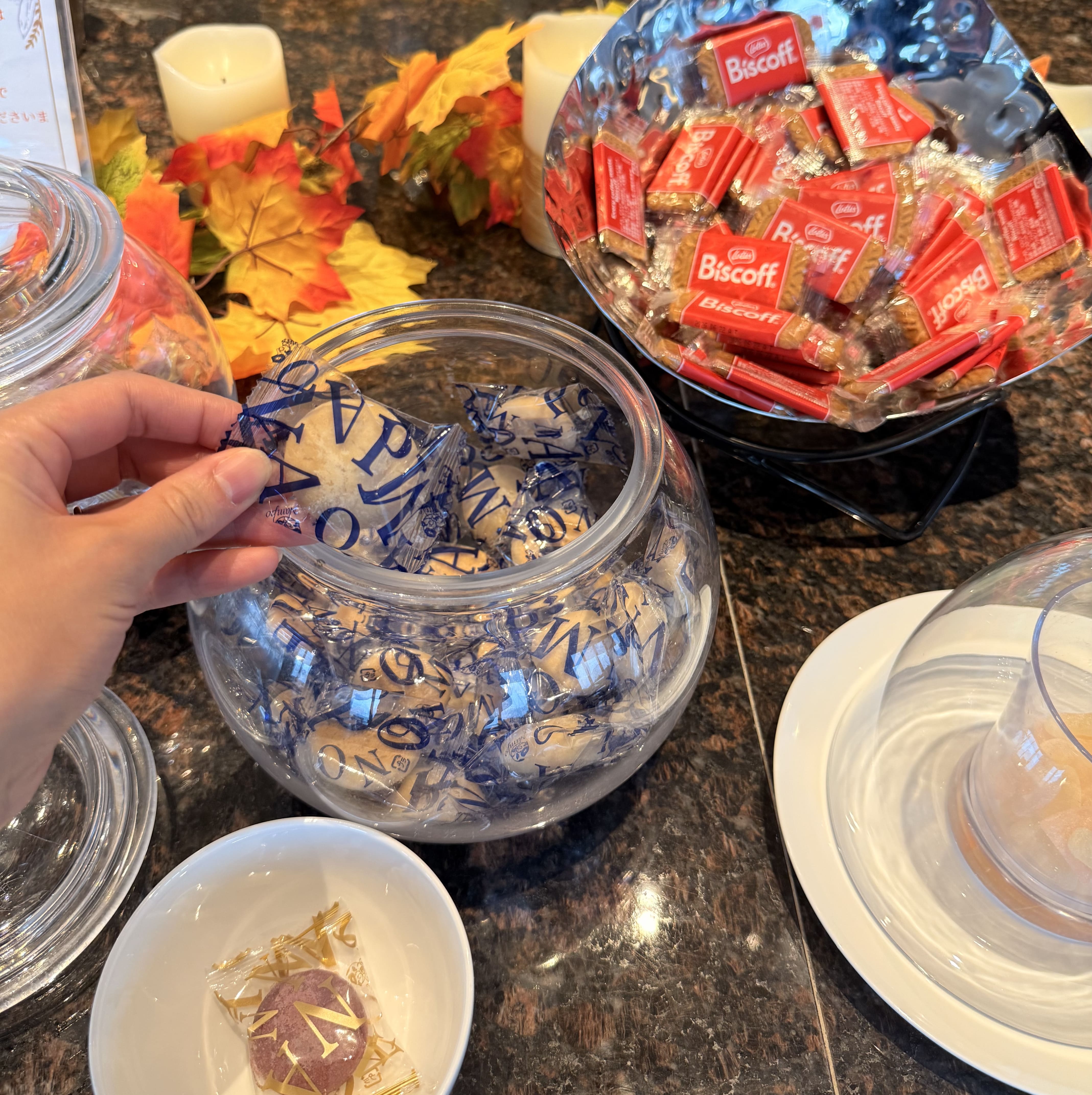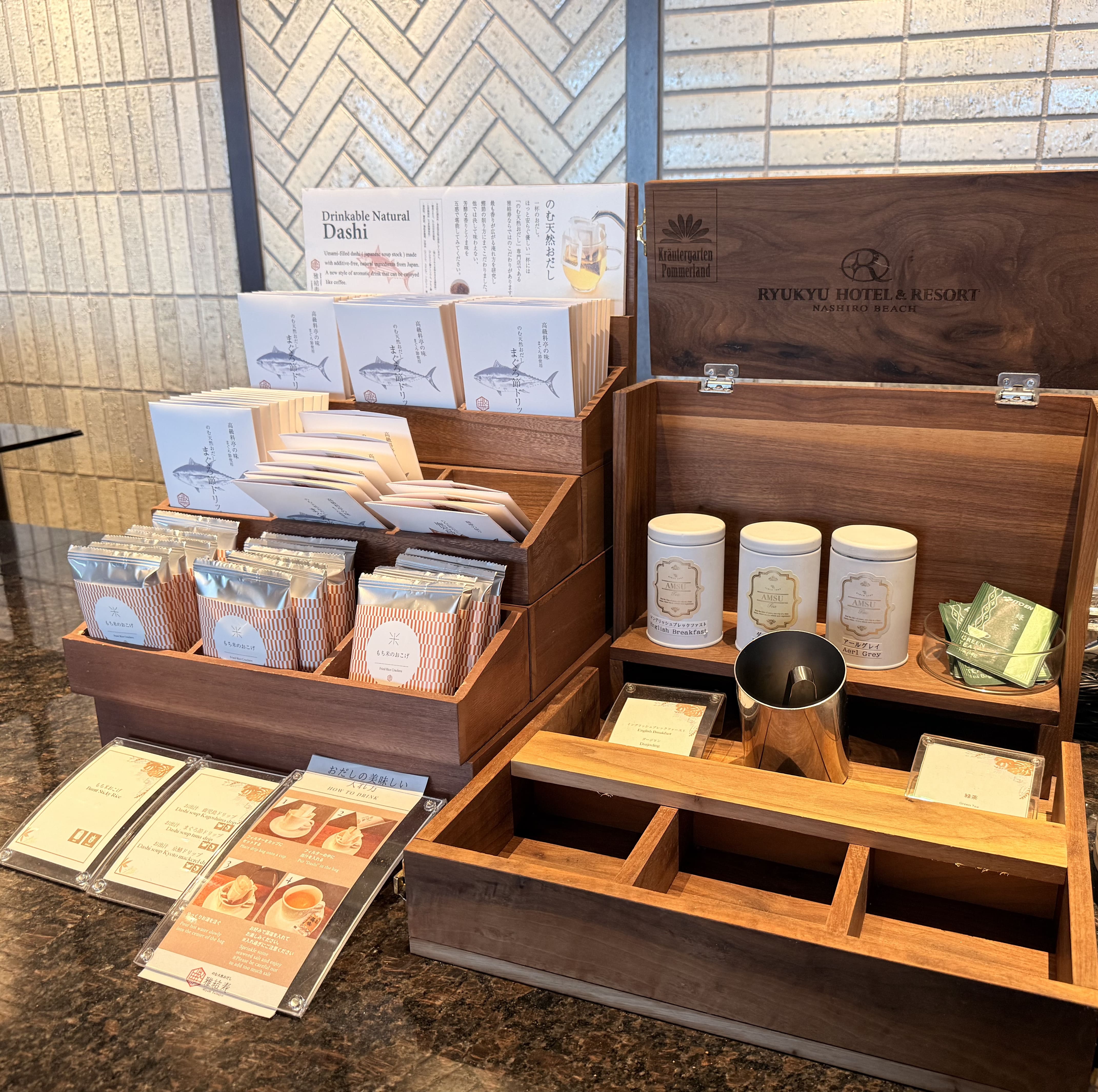 那覇空港から車で20分の南国リゾートホテル。2022年開業なのでホテル内の施設もお部屋も綺麗で、ロビーの香りがとっても印象的でした。今回はプレミアクラブラウンジでチェックイン。 沖縄ならではのジーマーミ豆腐やちんすこうなどのスイーツと一緒にドリンクをいただきながら、ゆったりとラウンジで過ごせました。 野菜ジュースや100%フレッシュジュースもあり、ホットドリンクコーナーには珍しい『飲む天然おだし』も。このおだしがとっても美味しかったので、ぜひ飲んでみて欲しいです!