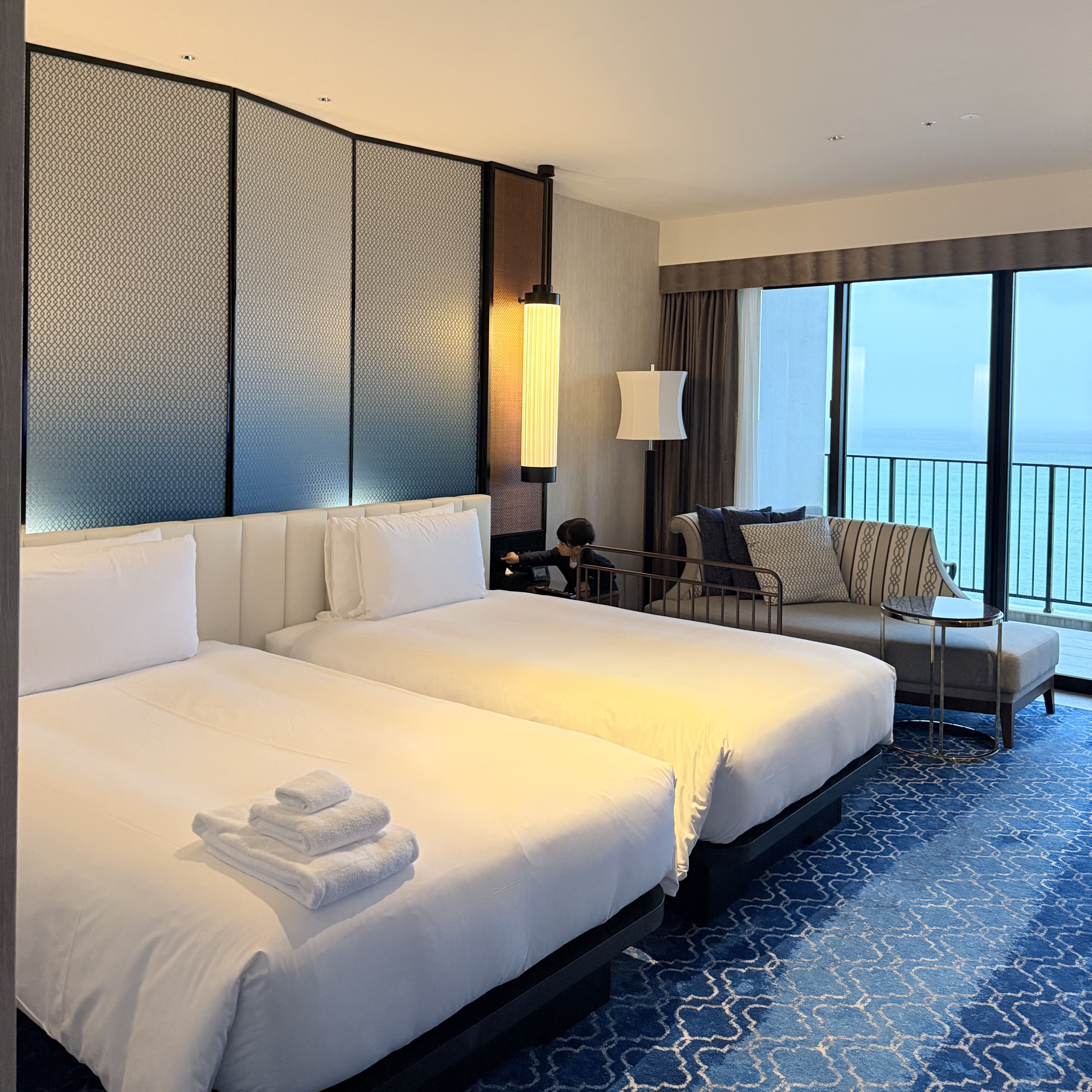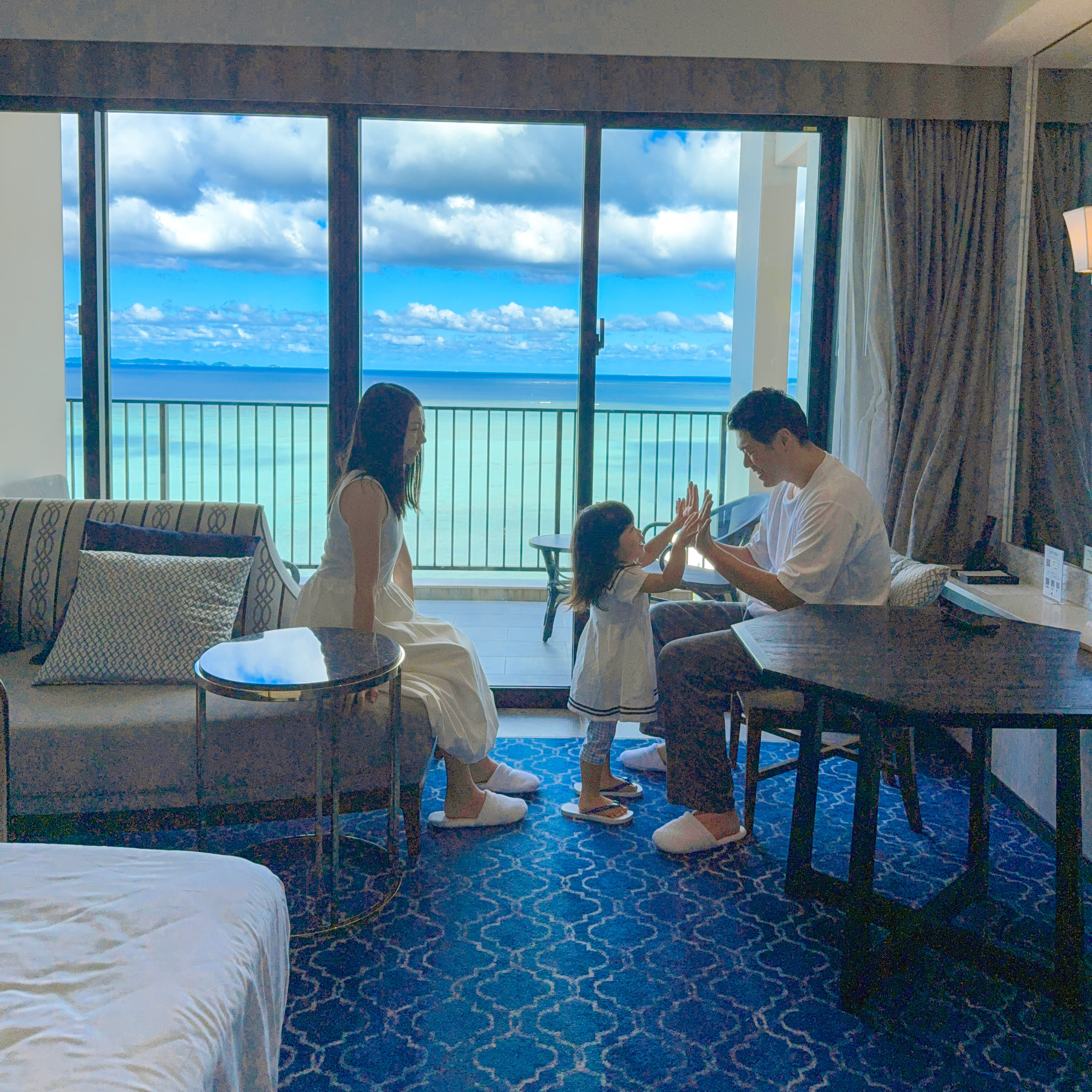全室オーシャンビューのお部屋からは、まるで海外のような絶景が広がっています。 お部屋はプレミアクラブルーム。 広くて高級感があり、バルコニーからの景色はいつまでも眺められます。 お風呂はバスタブ付きなので子連れにも嬉しい。 昼間の絶景も素晴らしいですが、夜のライトアップも最高!