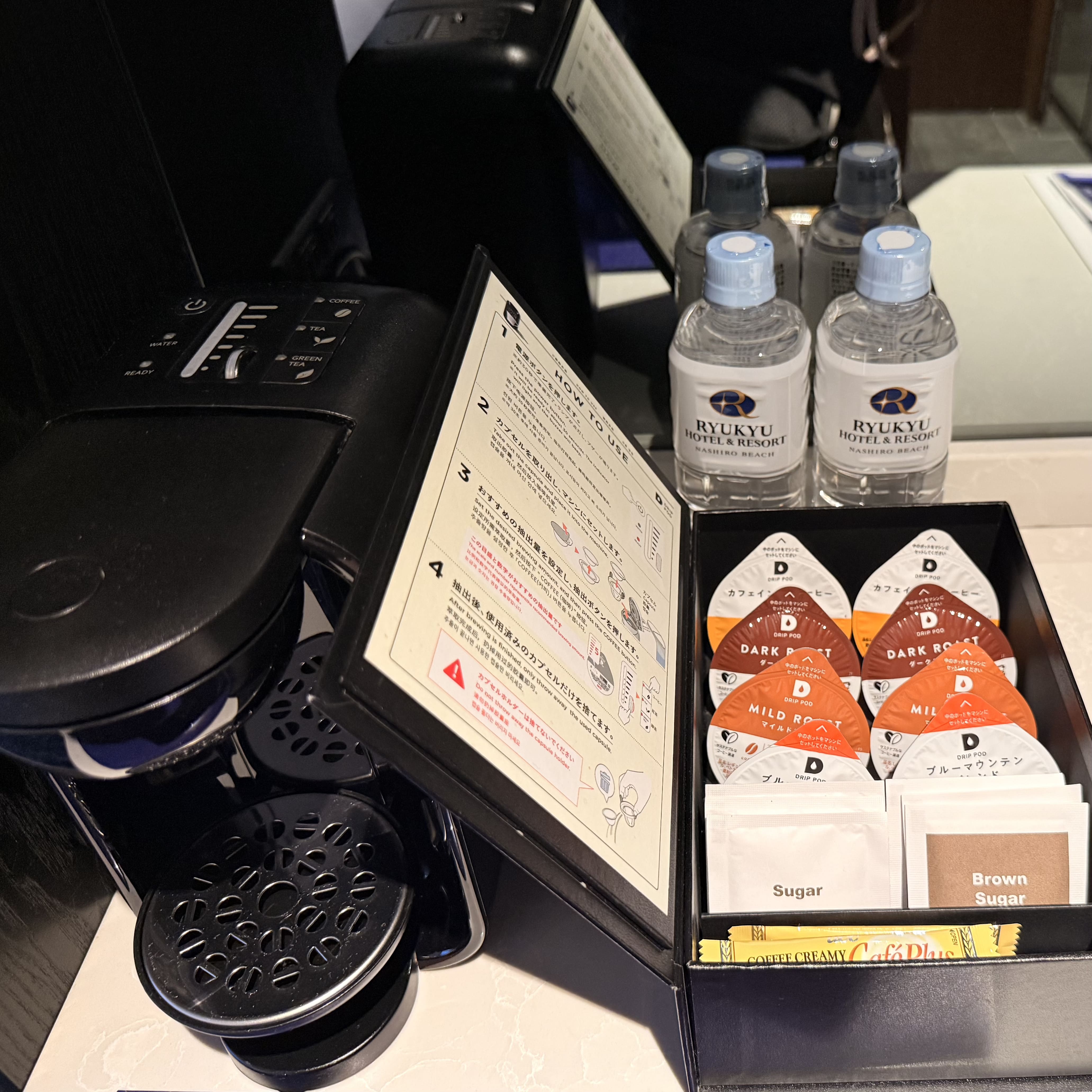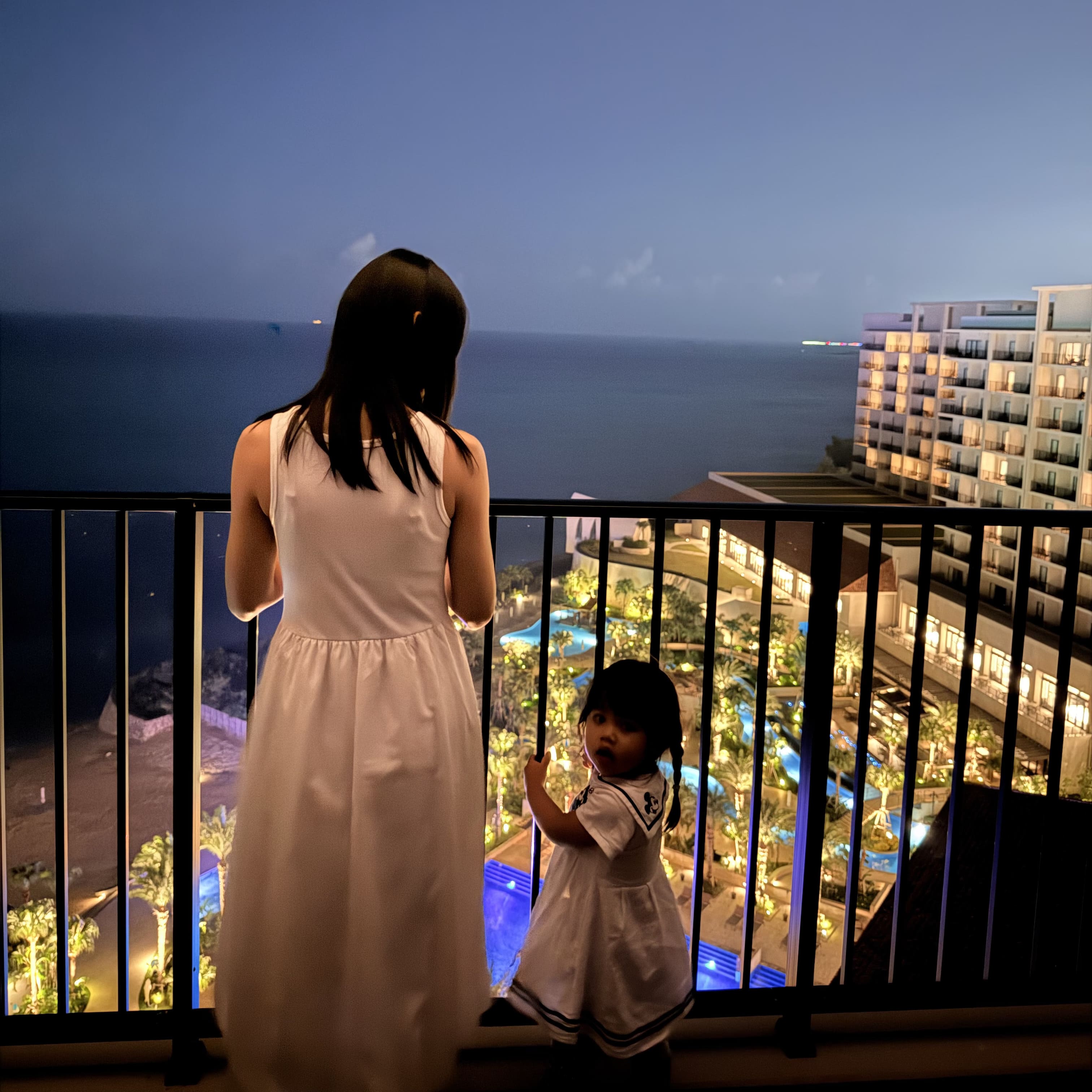 お部屋に設置してあるサービスのコーヒーは4種類もあって、カフェインレスコーヒーも用意されていました。 子供が寝た後はライトアップされたプールを眺めながらバルコニーでコーヒータイム。 プールサイドでは噴水ショーも行われています。11月でも外はちょうど良い涼しさでとっても快適でした!