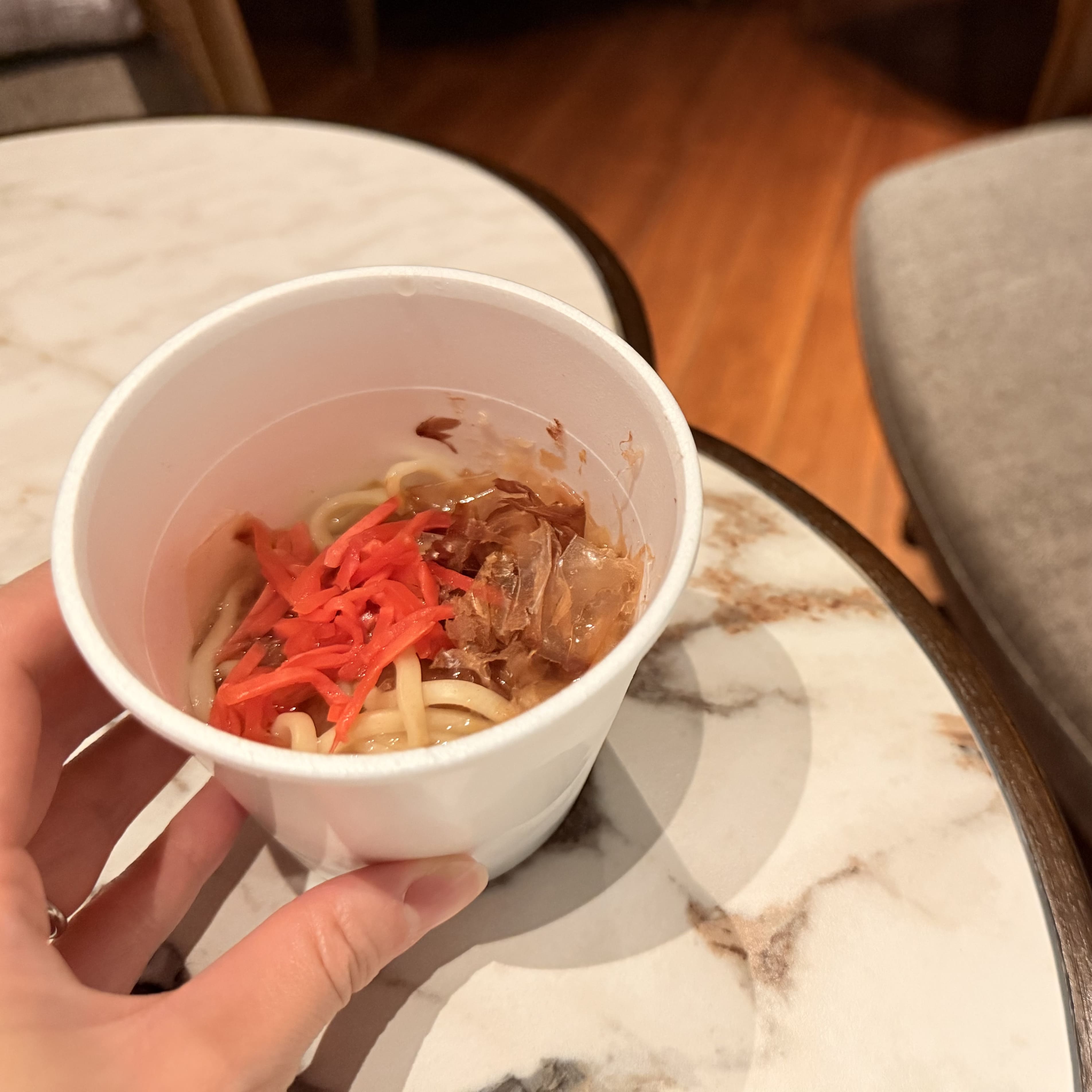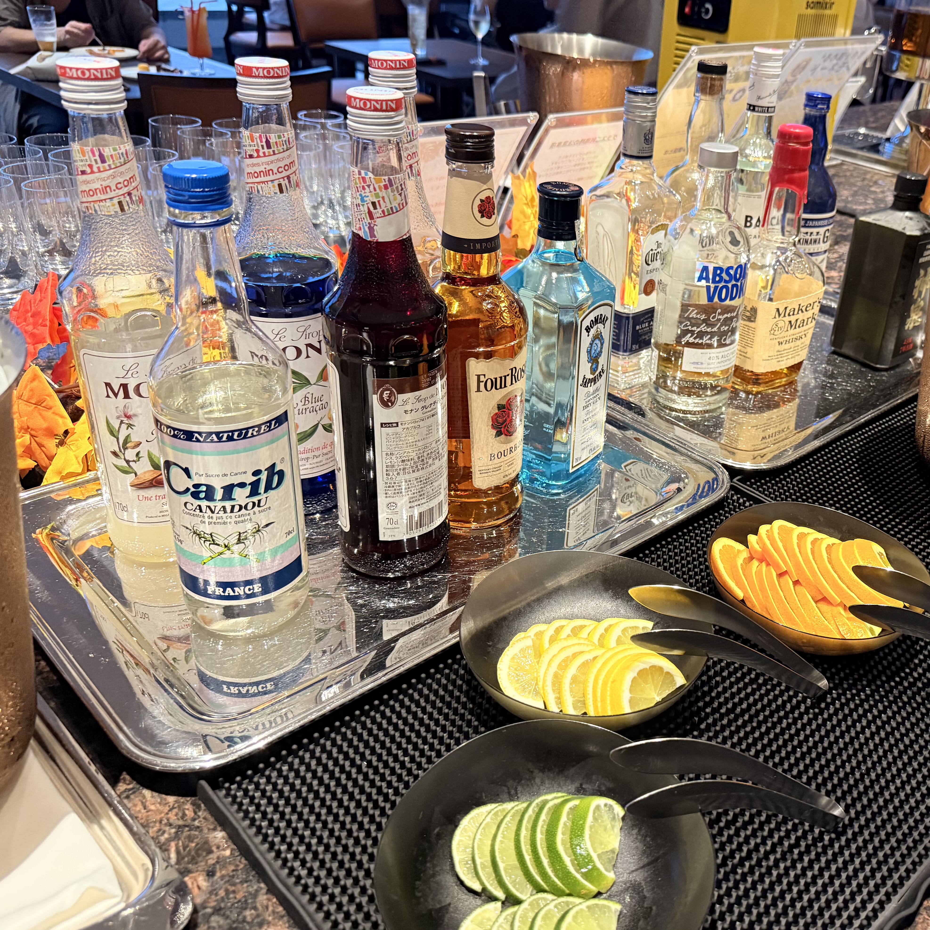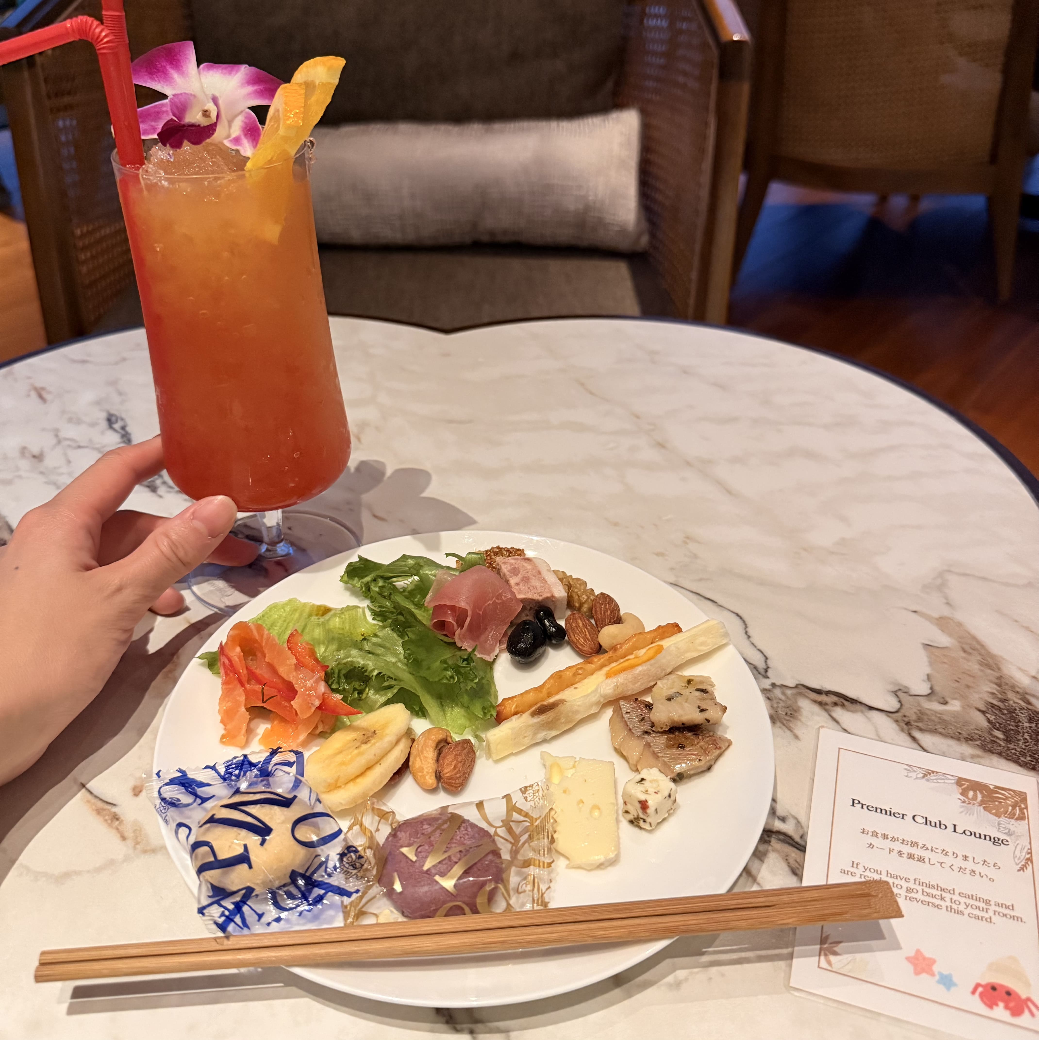 プレミアクラブラウンジの夜はバータイム。 13歳未満は入れないので、夫婦で交互に利用しました。 バーテンダーさんに本格的なカクテルも作ってもらえます。 お酒が飲めない人も嬉しいノンアルコールカクテルも。 私は名城サンシャインをつくってもらいました!チーズやナッツ、チップス、デザートなどと一緒に夜のラウンジを楽しみます。 18:30からは沖縄そばもの提供もありました。