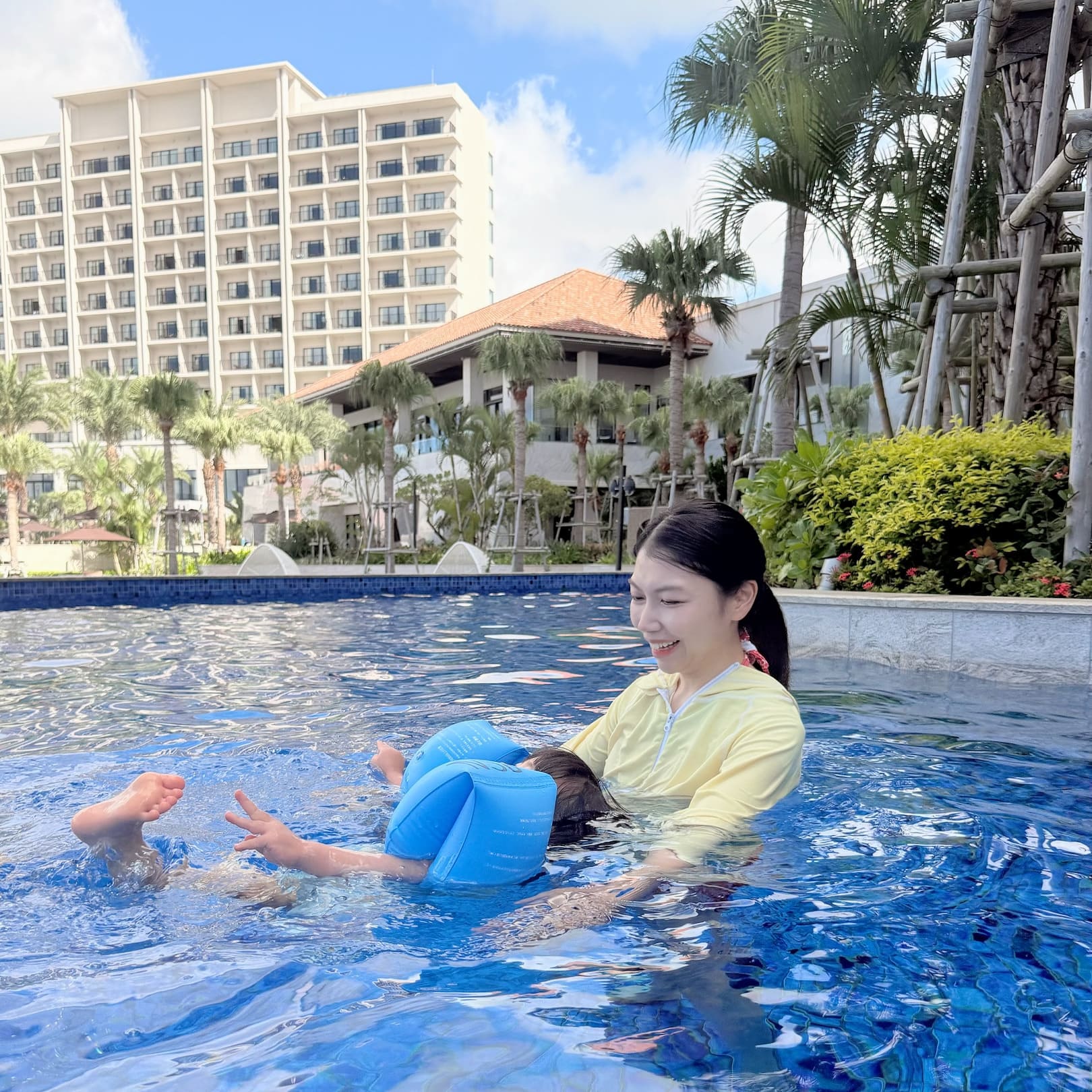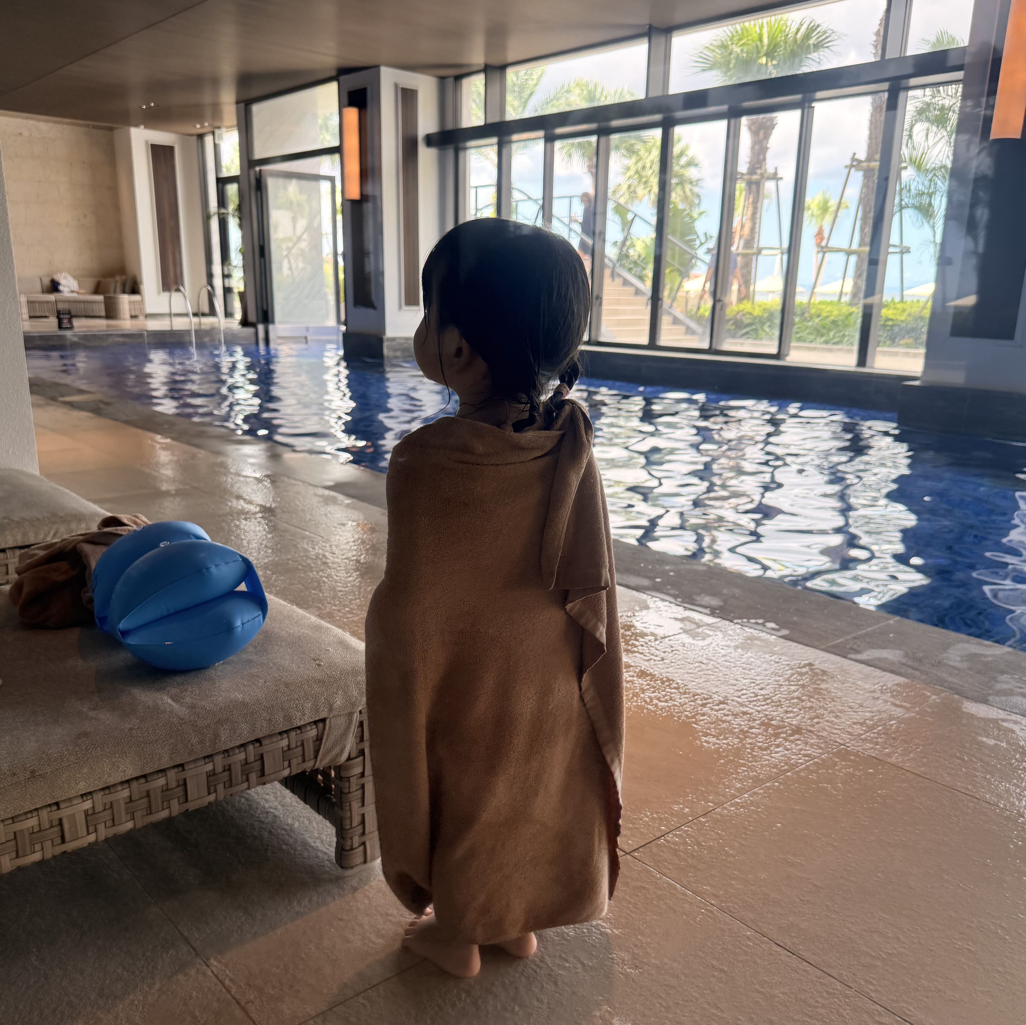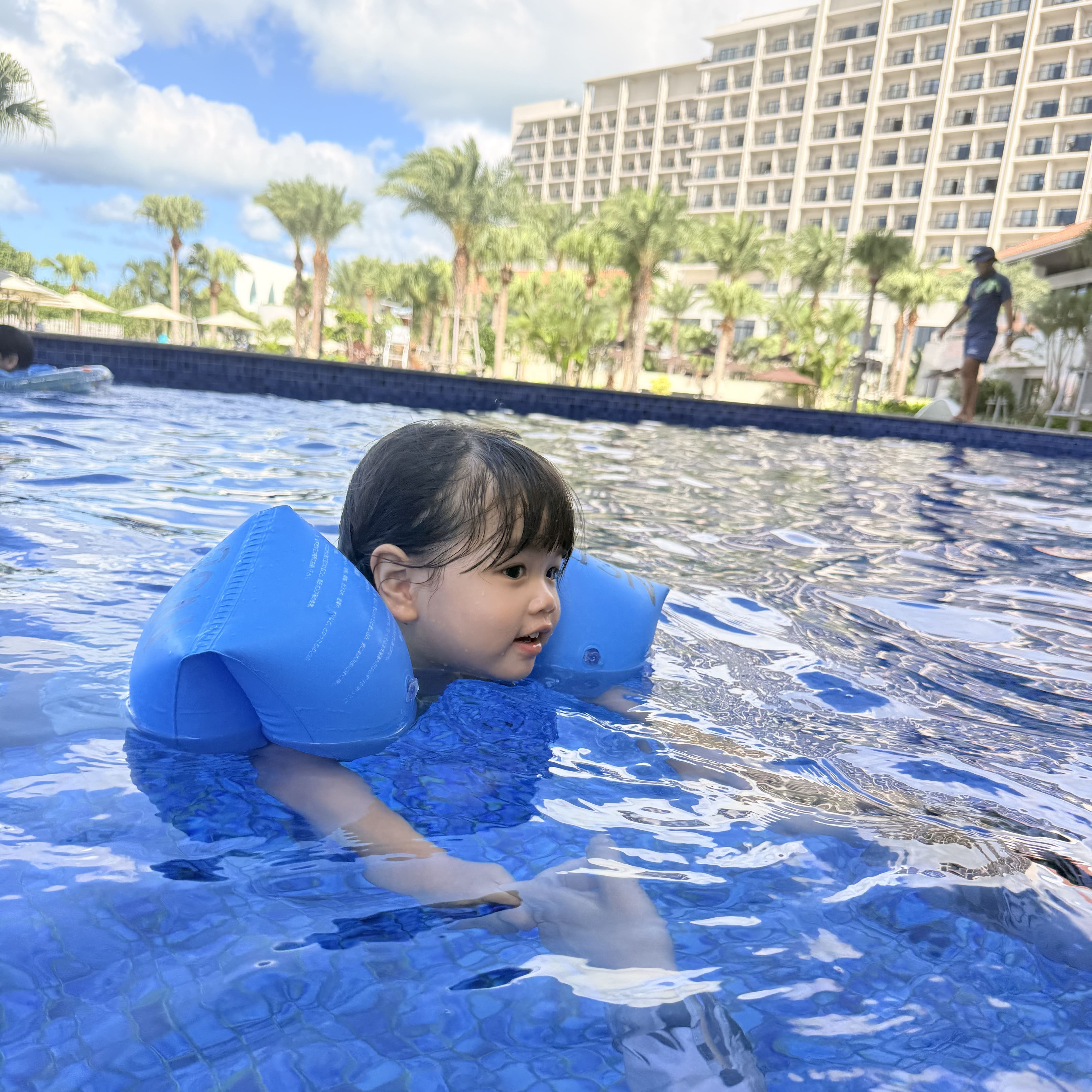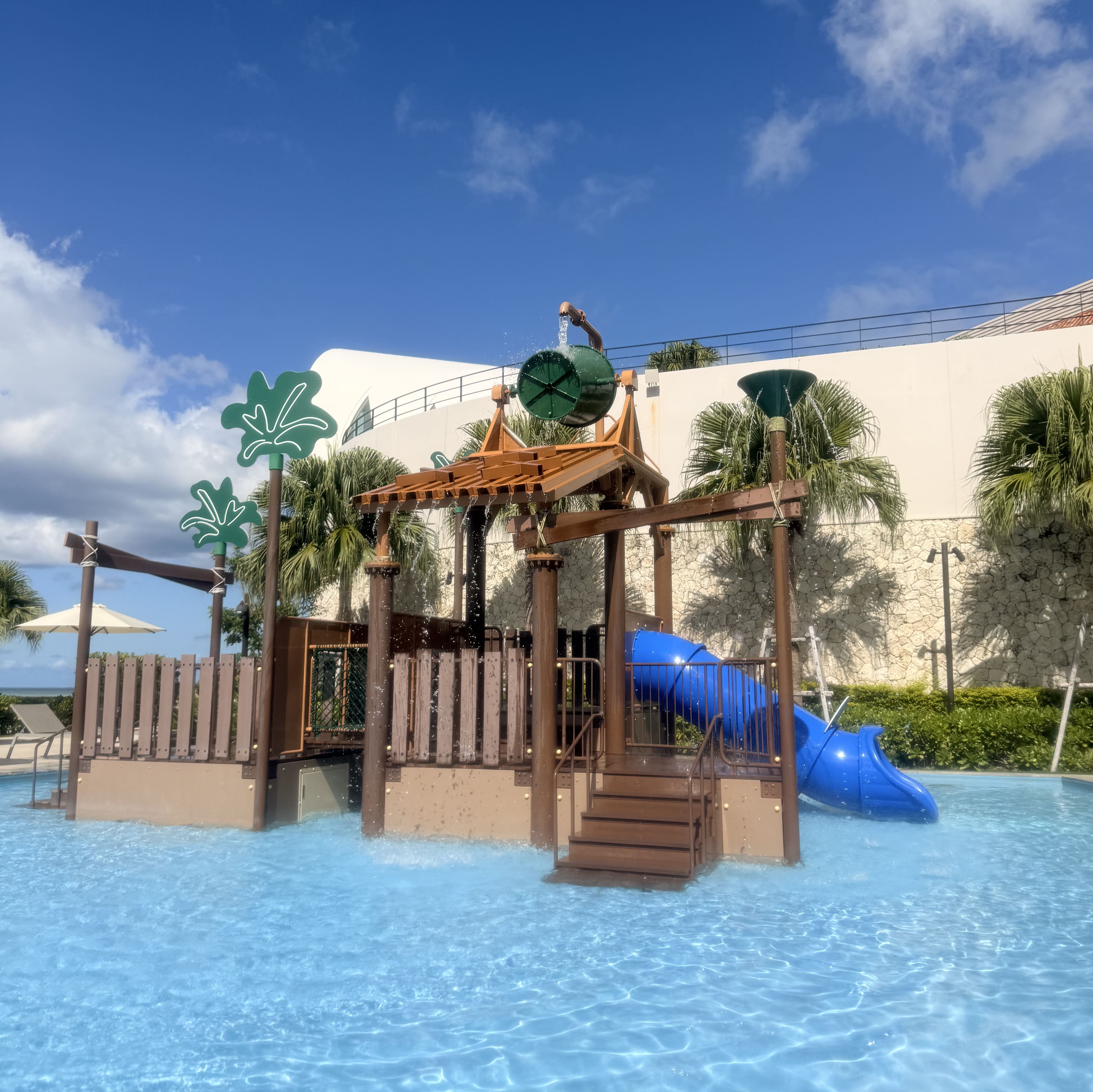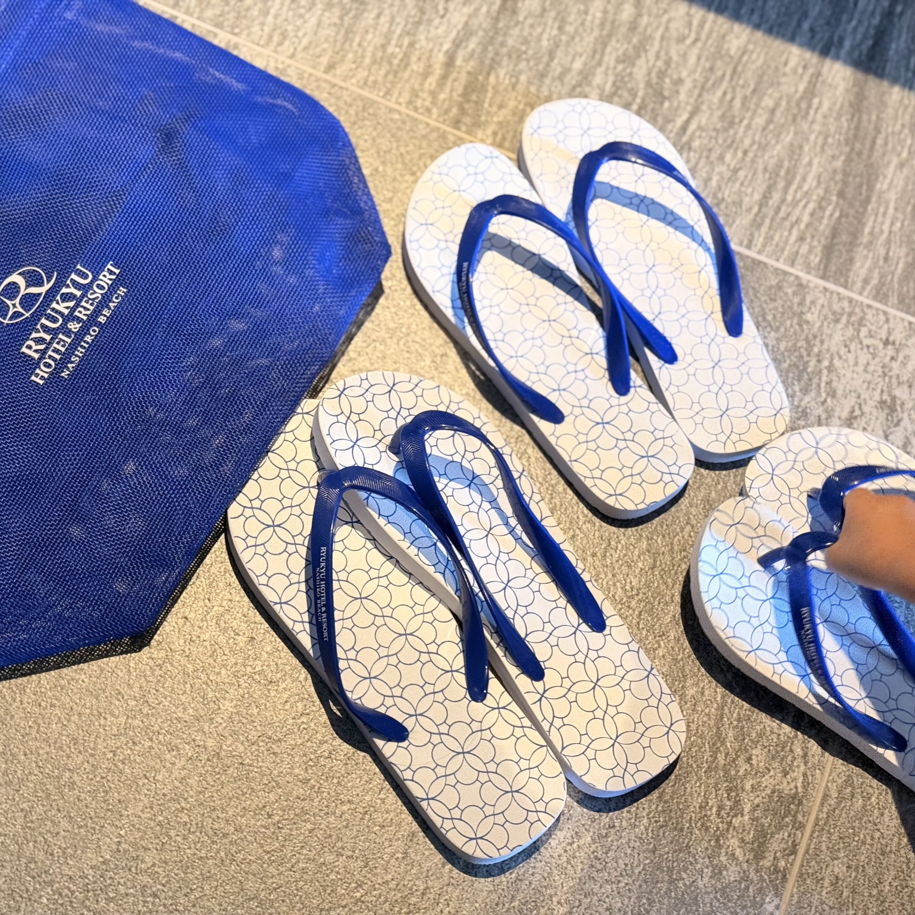 琉球ホテル&リゾートのプールは沖縄最大級! キッズプールやオールシーズンプール、流れるプールなど全部で6種類のプールがあります。 11月はさすがに寒くてプールは無理かな?と思っていましたが、インドアプールとオールシーズンプールは水温が高めに設定してあるので問題なく遊べました。 アームヘルパーは無料で貸出してもらえるので、2歳の娘も1人でプールを泳げて大喜び! 遊泳可能なビーチはかなり遠浅ですがサンゴが多いのでマリンシューズは必須。 タオルはマリンハウスで無料で借りられます。 プレミアクラブルームとスイートルーム宿泊者には夏季限定のルームアメニティとして ホテルオリジナルのビーチバッグとおしゃれなビーチサンダルが用意されていました。 子供の分まであるのがありがたいです。