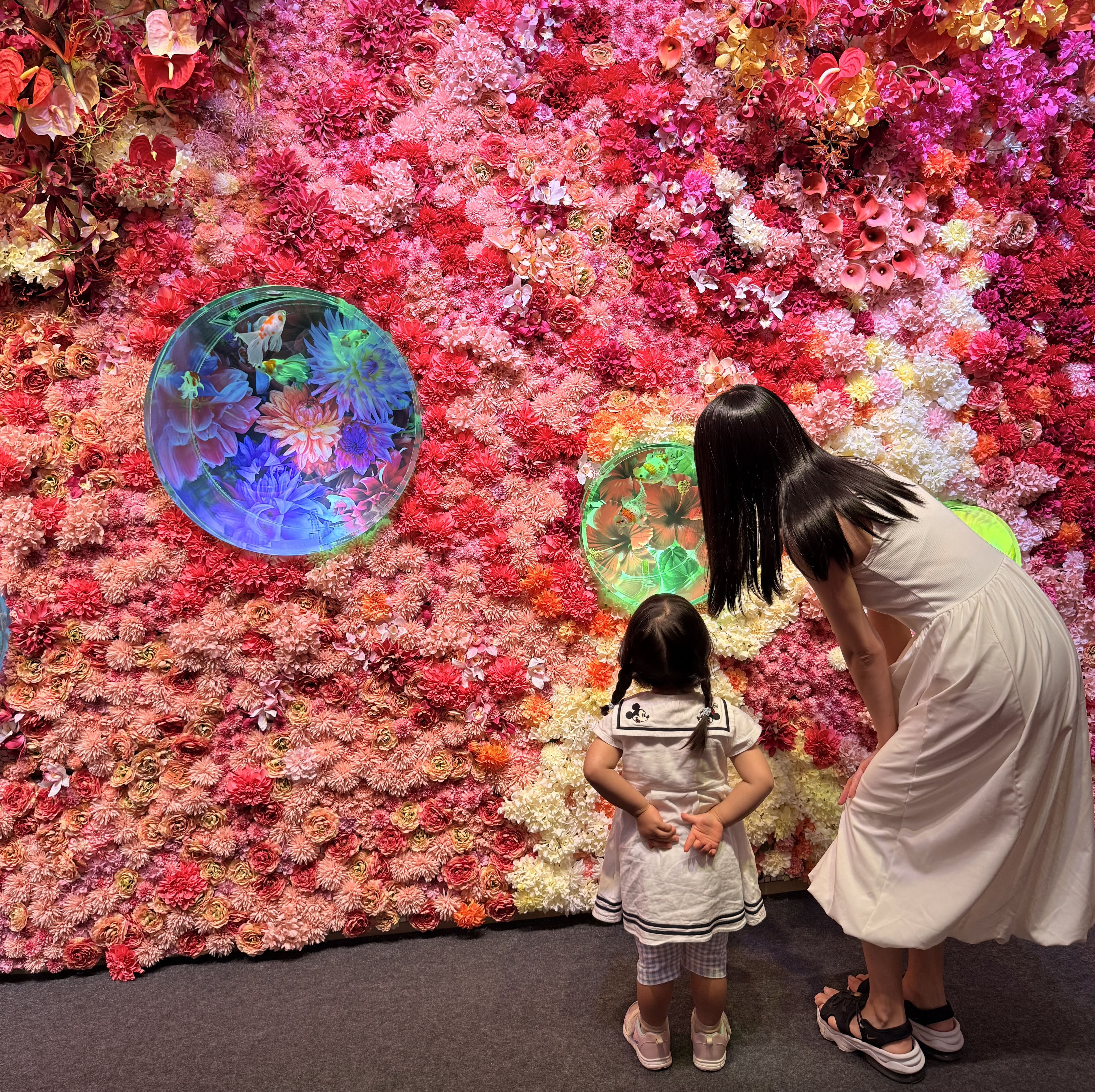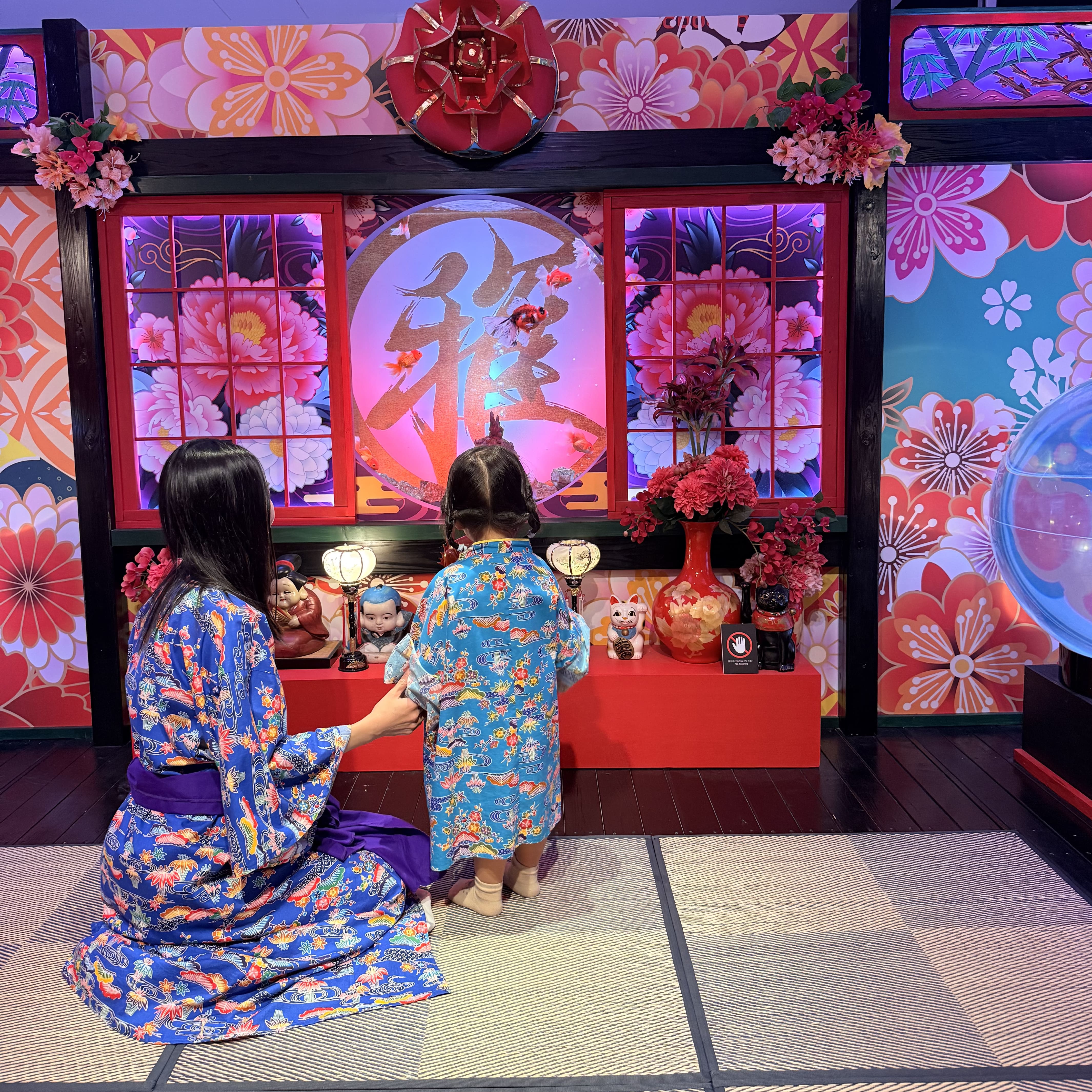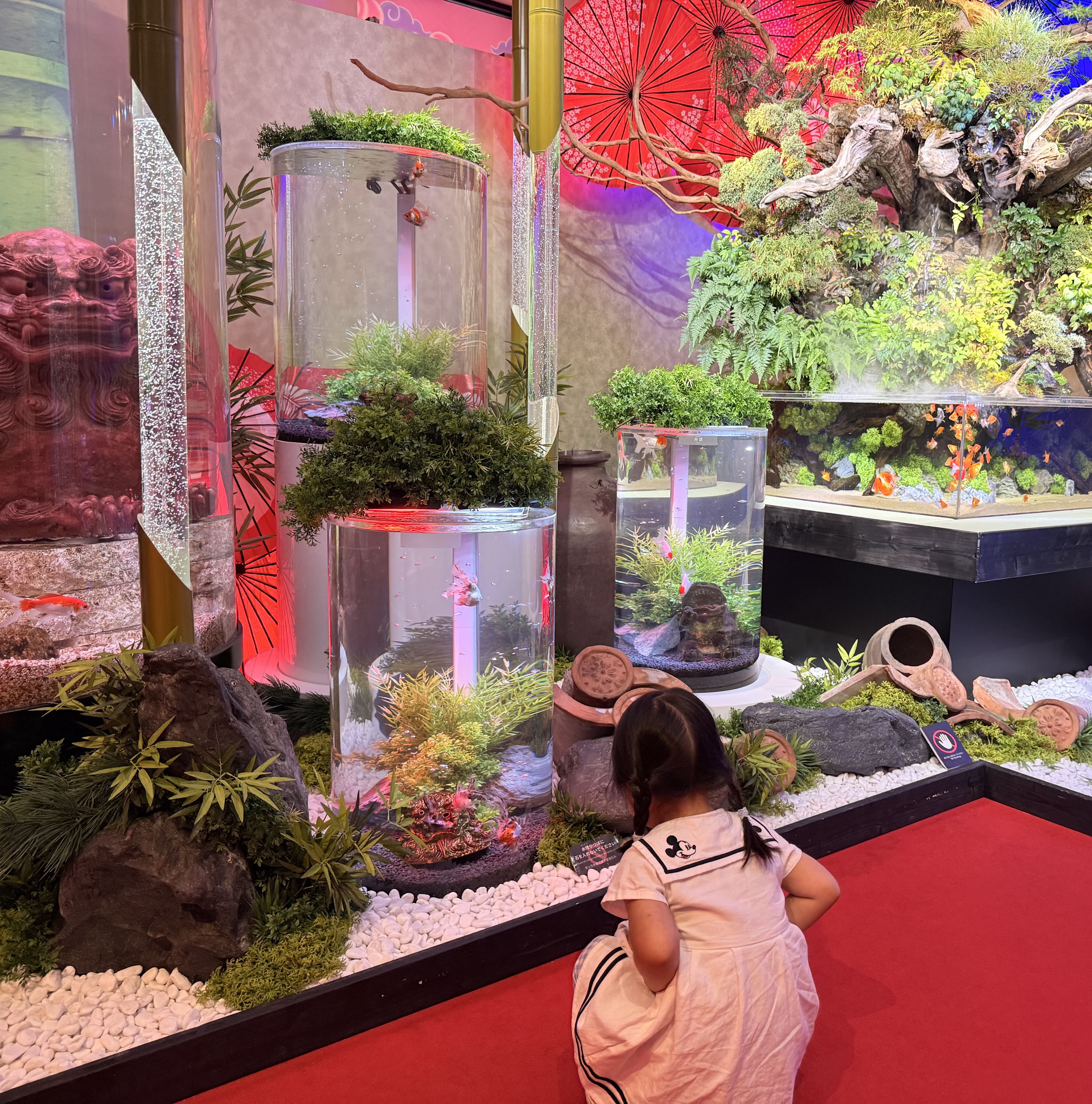 プールを大満喫したので、2歳の娘は一旦お昼寝。 起きた後は沖縄アウトレットモールあしびなー内にある『沖縄金魚ミュージアム』に行ってきました。 金魚×アート×沖縄の神秘的な空間で、なんと2,000匹55種類もの金魚がお出迎え。 子供目線でも見える高さにあるので娘も目をキラキラさせながら楽しんでいました。 琉球衣装の無料体験もあり、沖縄の新感覚スポットとしておすすめです!