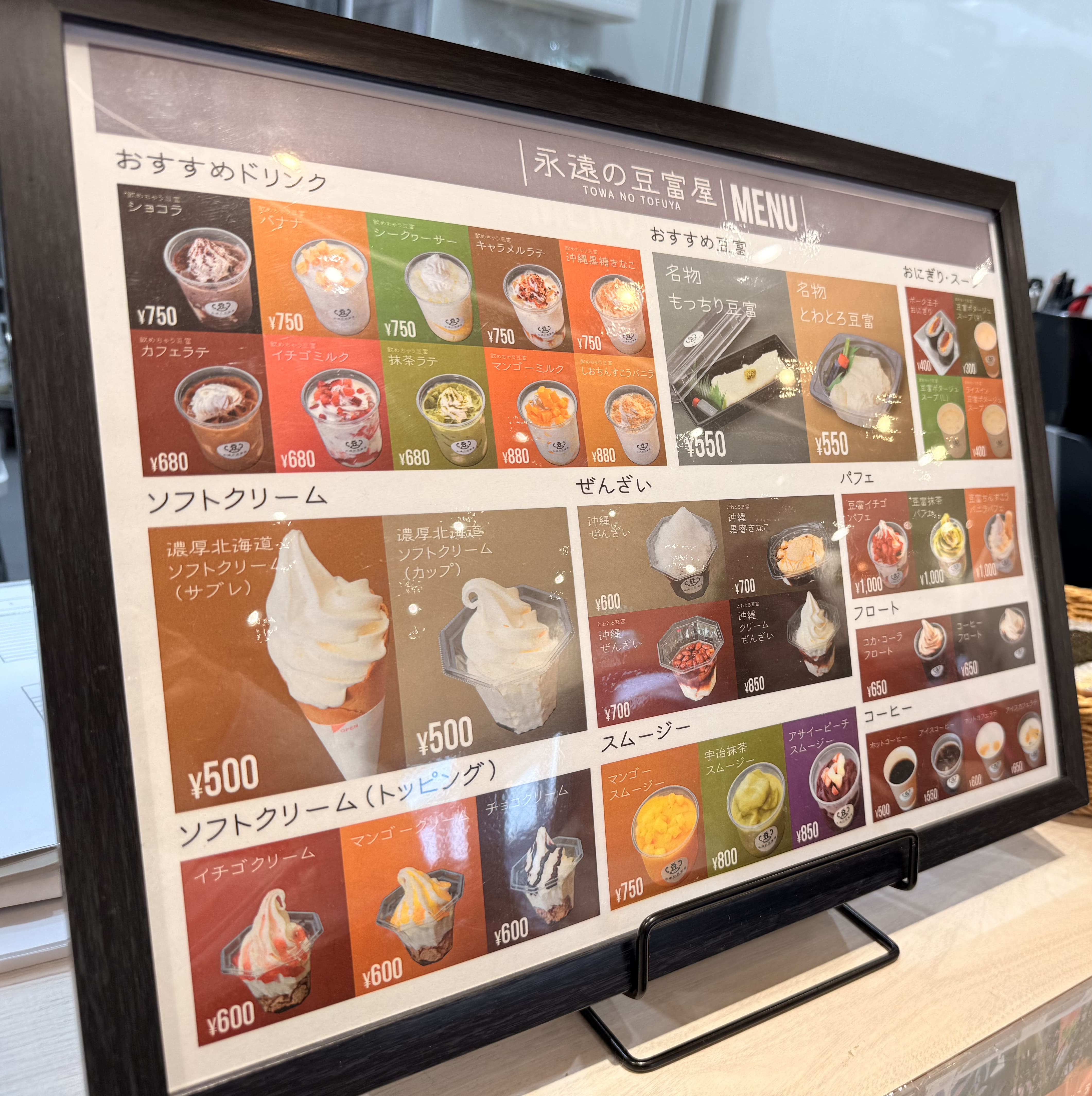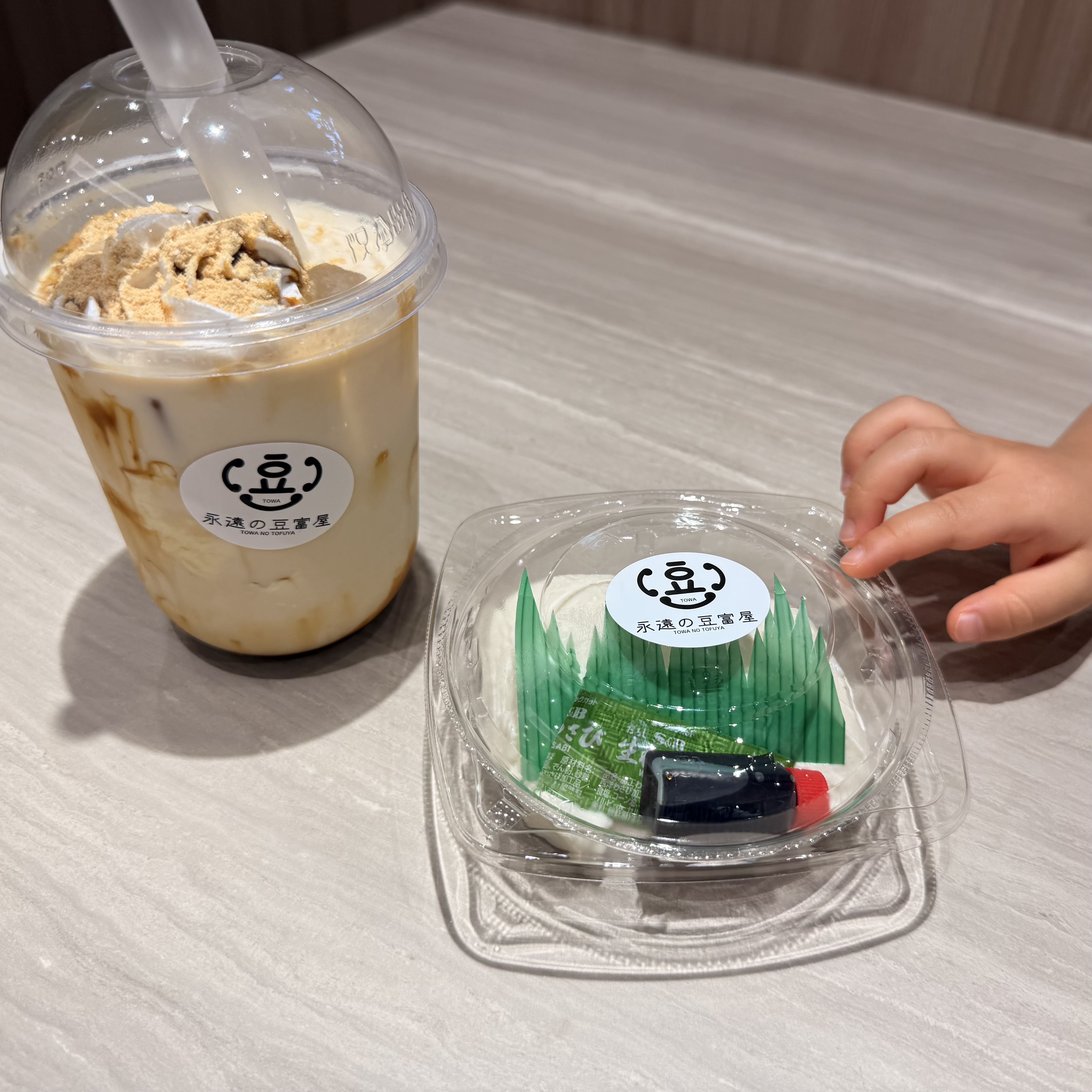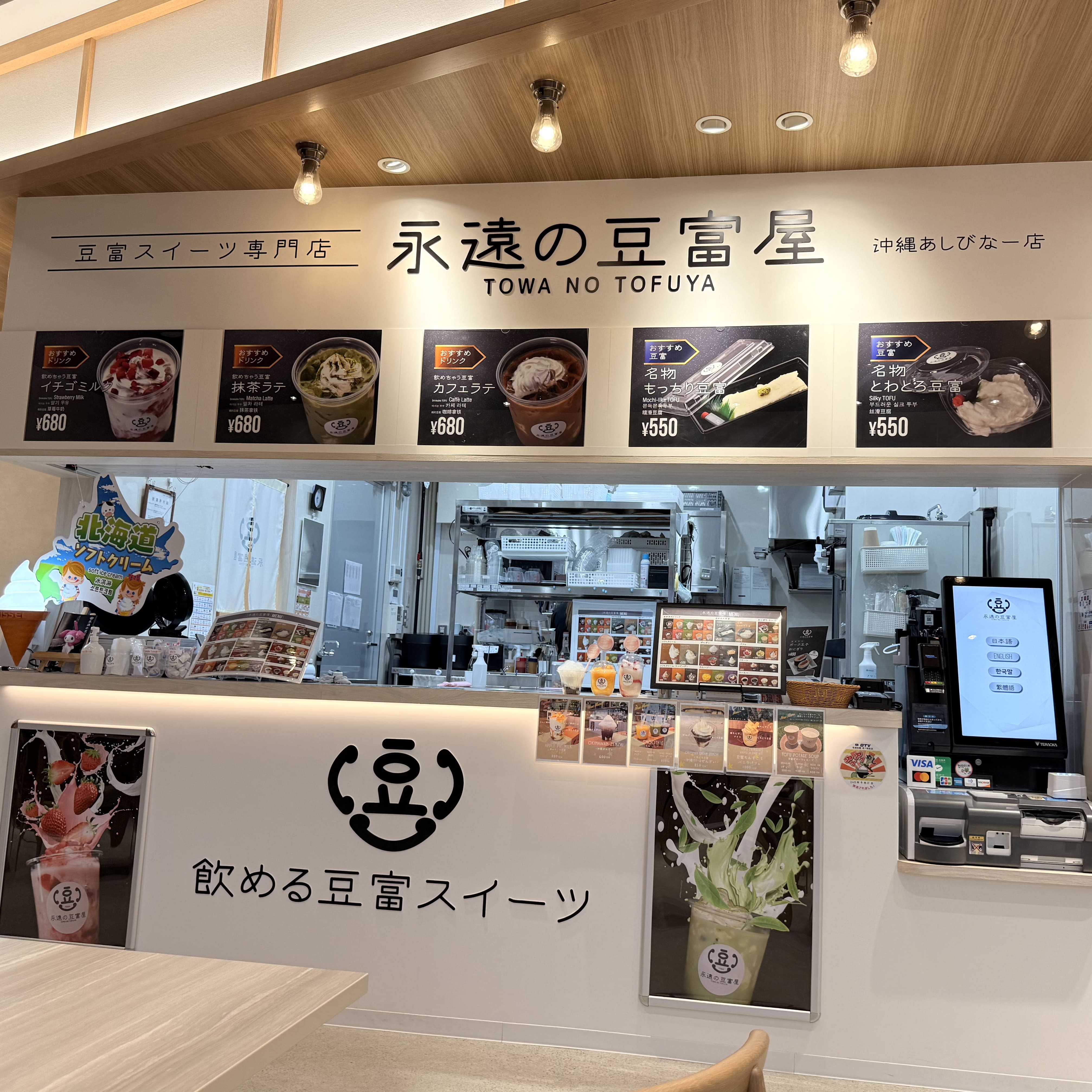 沖縄アウトレットモールあしびなー内にある豆腐専門店。 『名物とわとろ豆腐』と『飲めちゃう豆腐 沖縄黒糖きなこ』ドリンクを注文しました。 とわとろ豆腐は食感がもっちりとしてほんのり甘く、あまりの美味しさに感動...! 甘めの醤油とワサビとの相性も抜群でした。 沖縄黒糖きなこドリンクの中にも豆腐が入っています。 ドリンクに豆腐?と思いましたが、飲めちゃう豆腐と名付けてあるだけありますね。 ふわふわのクリームを飲んでいるようでとっても美味しかったです。種類も豊富なので飲み比べもおすすめです!