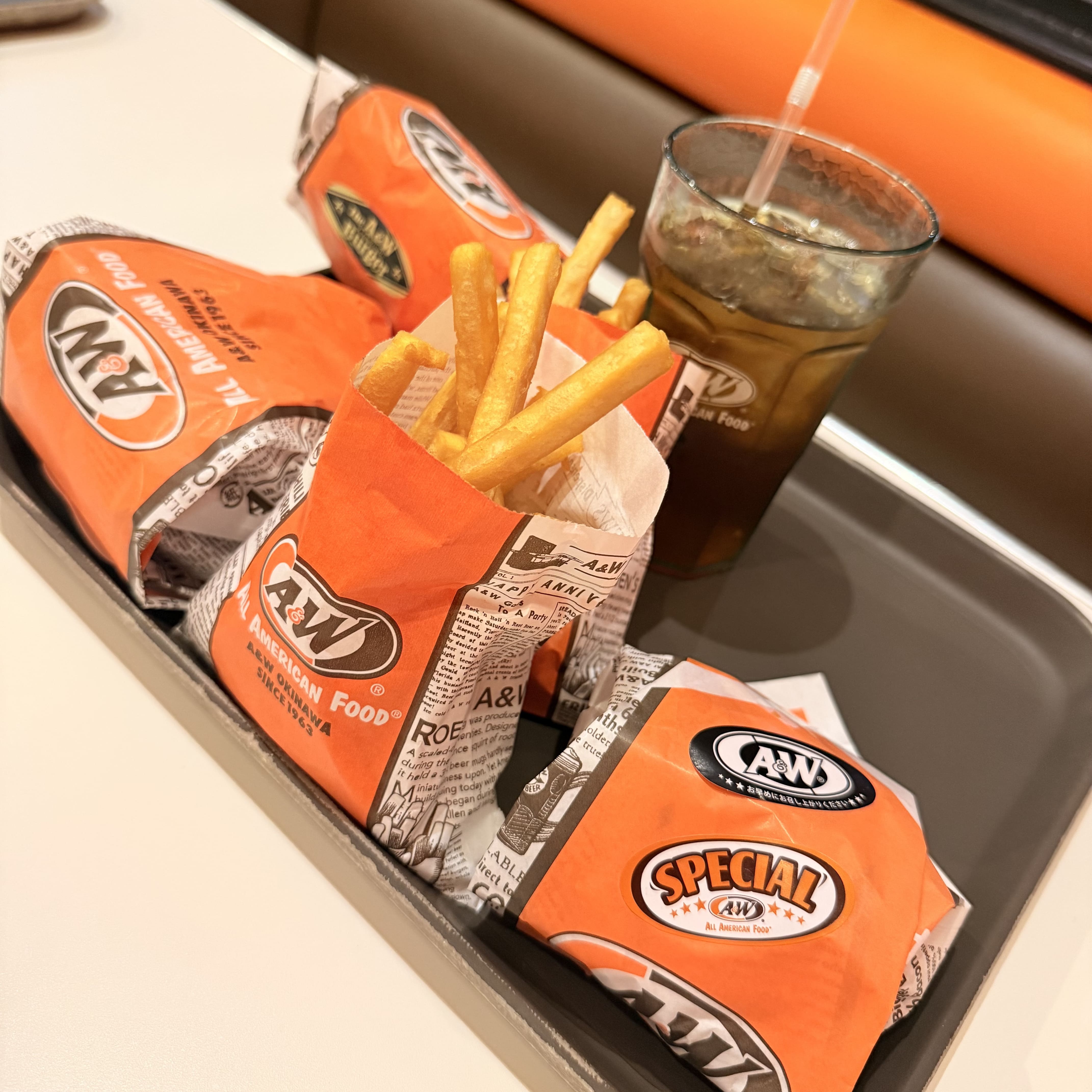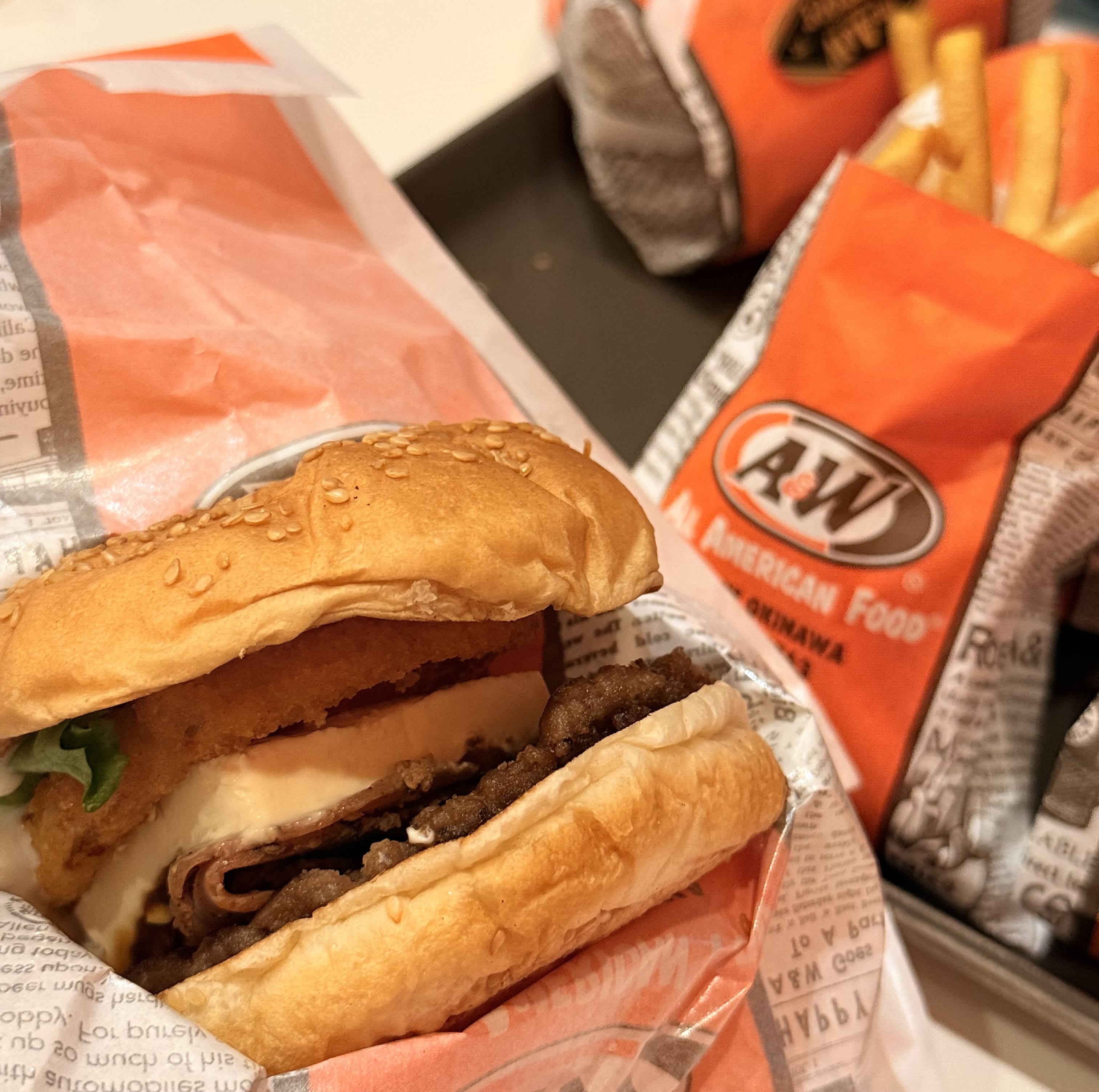 沖縄のソウルフードと言えばA&W。 店内はアメリカンダイナーのような雰囲気でテンションが上がります。 The A&Wバーガーのコンボセットと期間限定のクリーミーマッシュルームバーガーをいただきました。 A&Wバーガーはビーフ、トマト、フリルレタス、オニオンフライ、クリームチーズ、黒糖ペッパーポークと具沢山で挟んでおり、ボリューム満点で大満足。 クリーミーマッシュルームバーガーは濃厚なホワイトソースとごろごろのマッシュルームが挟んであり、秋にピッタリ。他のハンバーガー屋さんでもなかなか見ないバーガーです。 沖縄でしか食べられない味なので、沖縄に来たなら1度は食べて欲しい! ドリンクはルートビアにするとおかわり無料です。