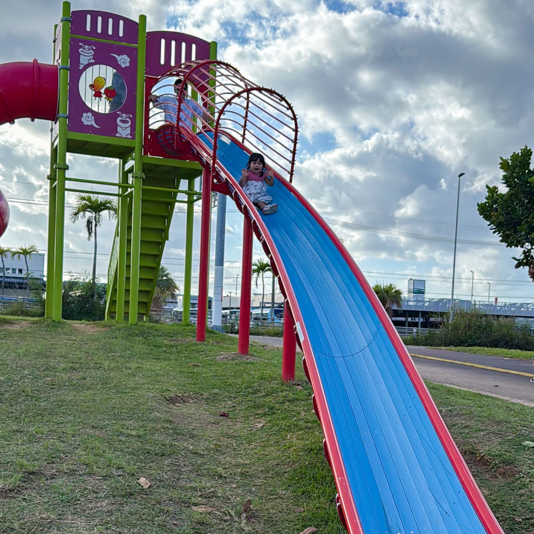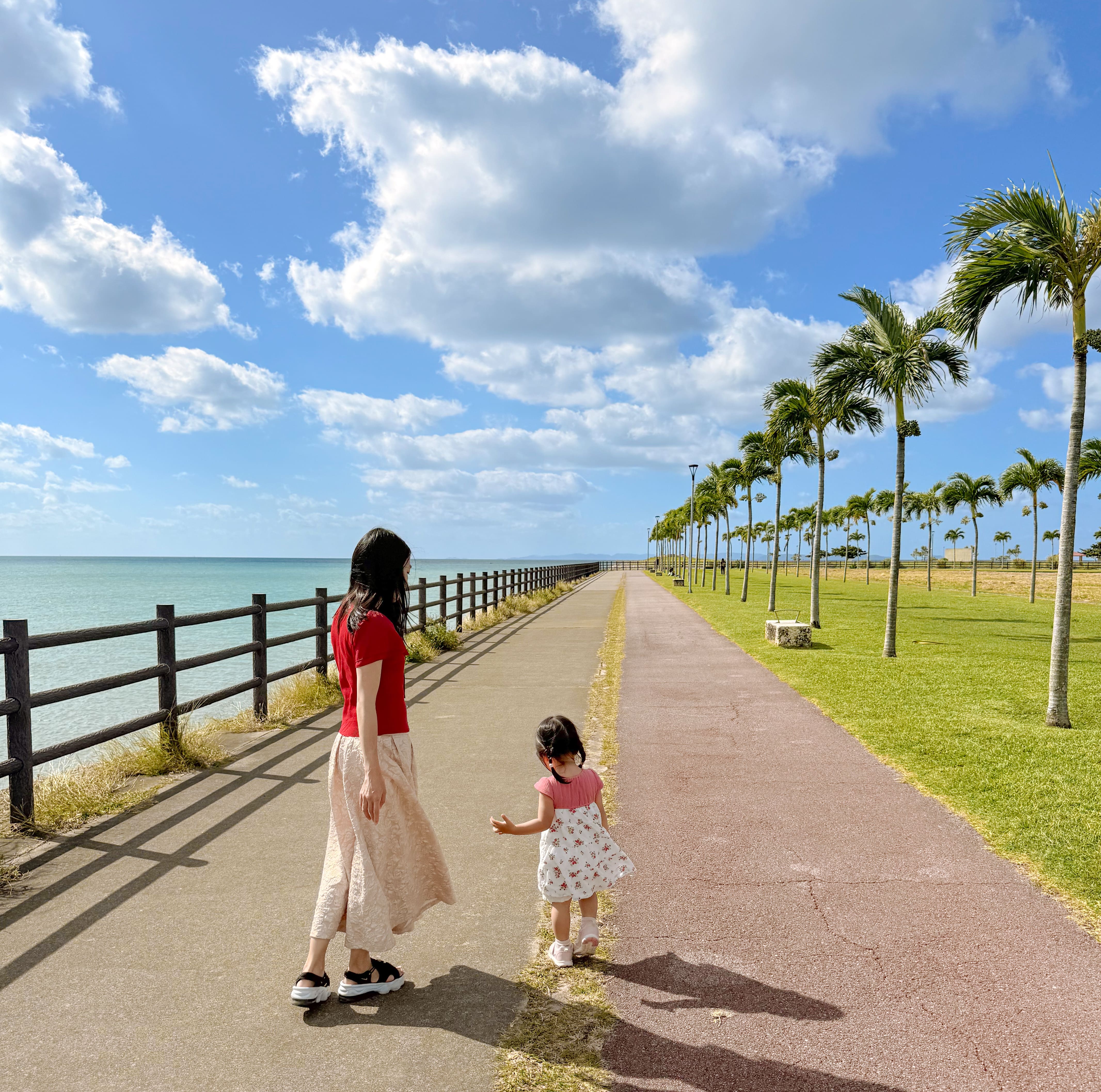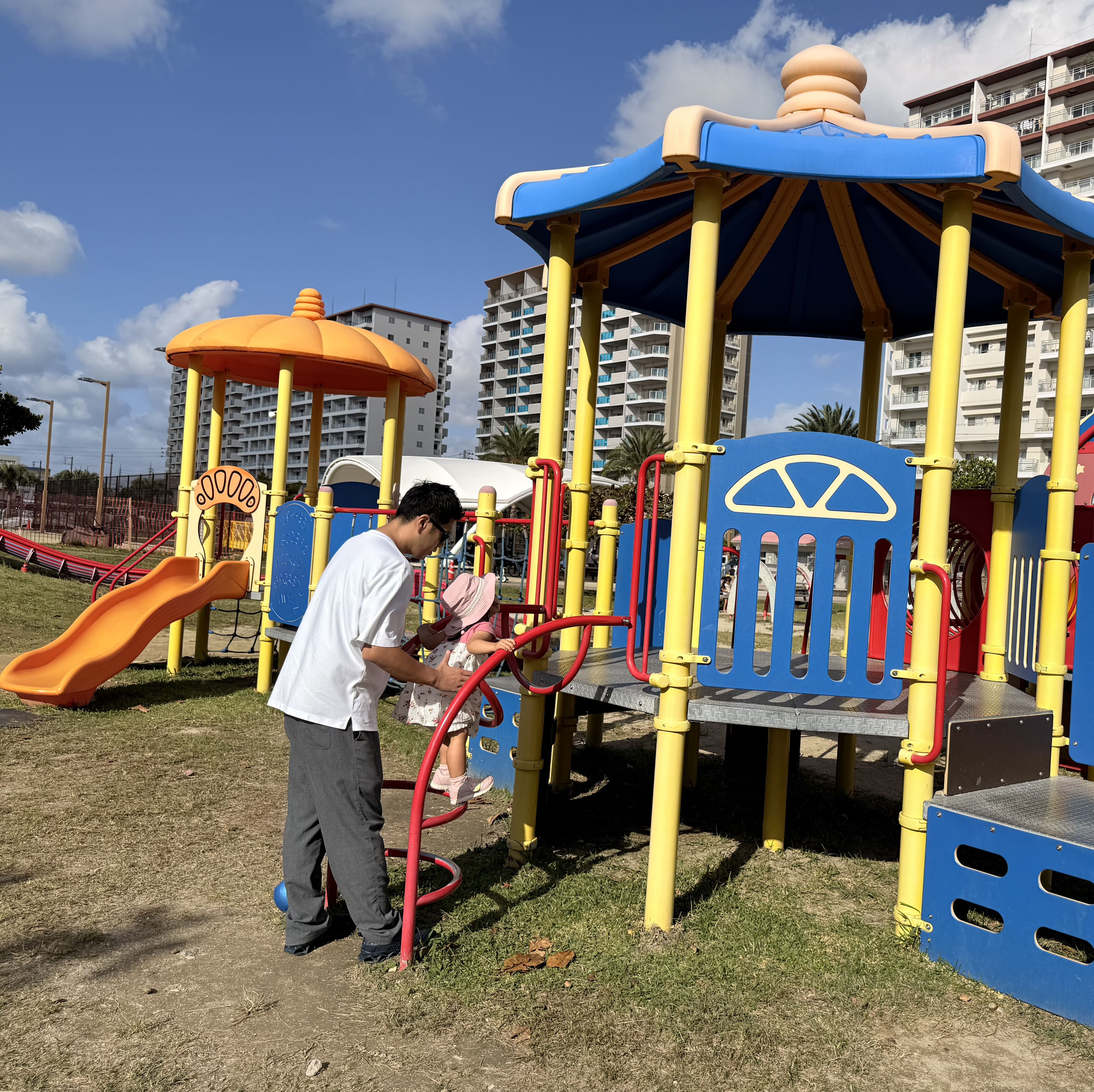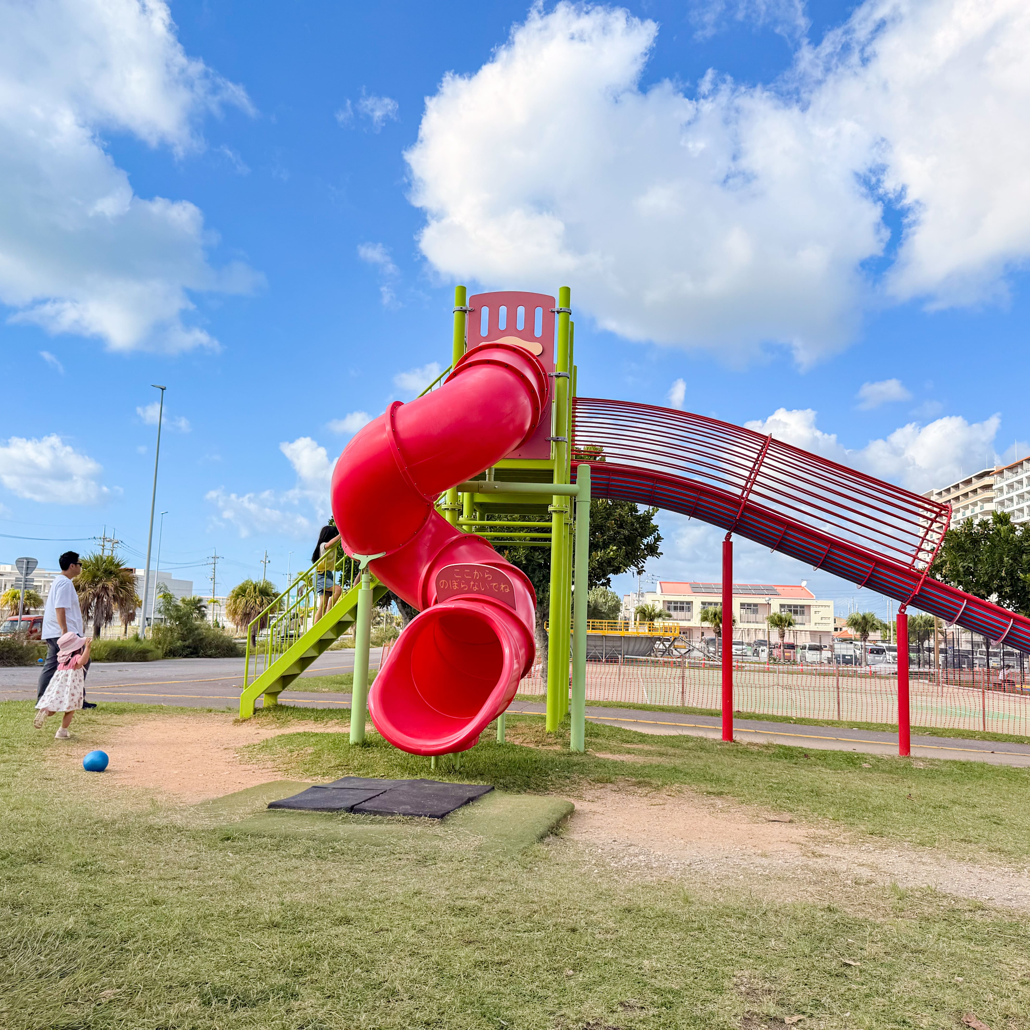 前日あしびなーに向かう途中にたまたま見つけた、子供が大好きな大型遊具の公園。 駐車場が1時間無料です。 ここで遊んで2歳の娘は1人でロング滑り台を滑れるようになりました! とにかく広くて遊具も綺麗で、那覇空港の近くで子供を遊ばせるのに最適な場所。 フライト前に運動させて飛行機の中で寝てもらいたい子連れ旅の方はぜひ行ってください。 バスケやテニス、スケートボードができる場所も隣にあるので、子供から大人まで楽しめそうでした。