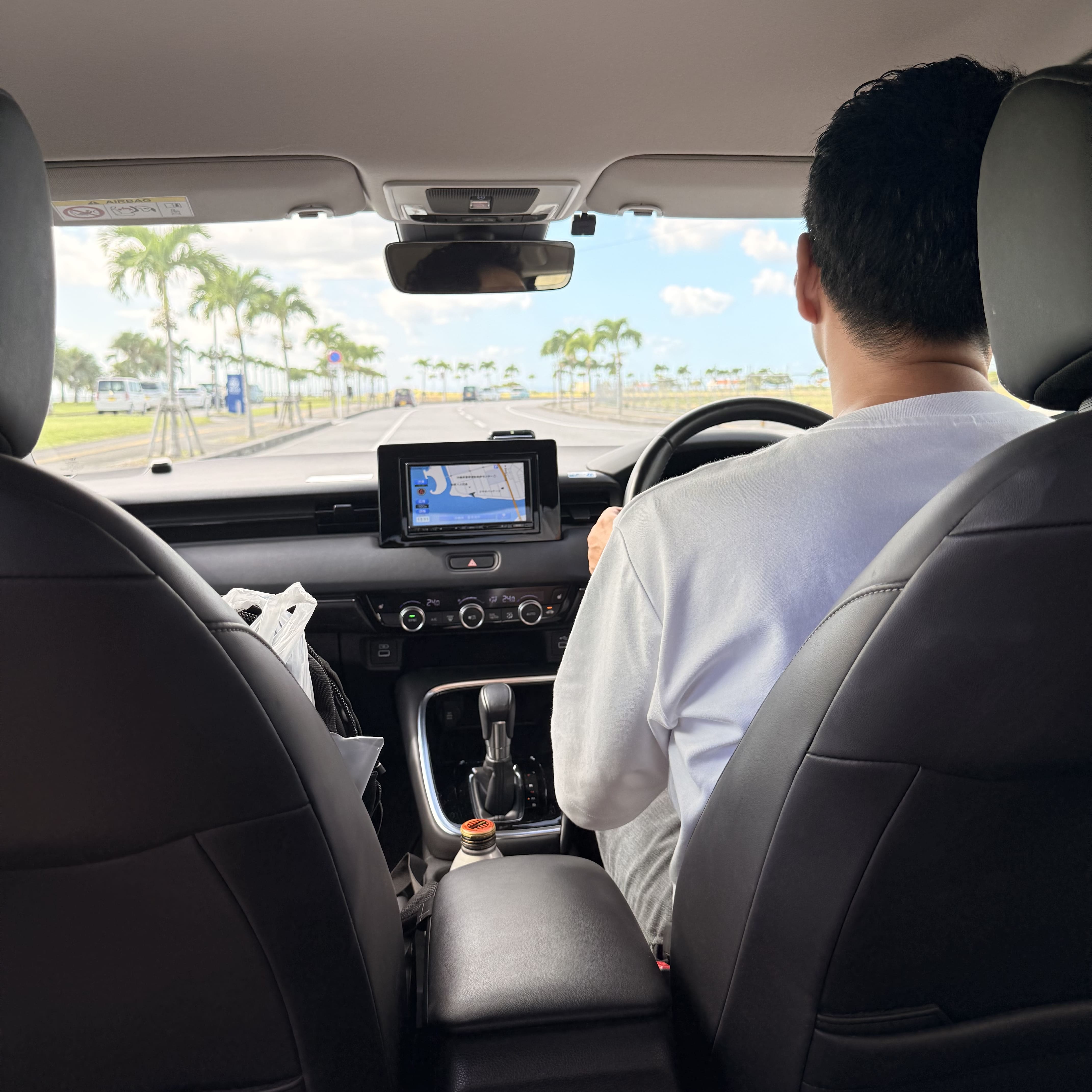 ホテルをチェックアウトしてレンタカーでヤシの木ロードへ。 道路の左右にヤシの木が並び、綺麗な海も見えて写真映えばっちり! 車で走るのも気持ちいいですが、芝生エリアもあるので車から降りて子供と走り回りました。