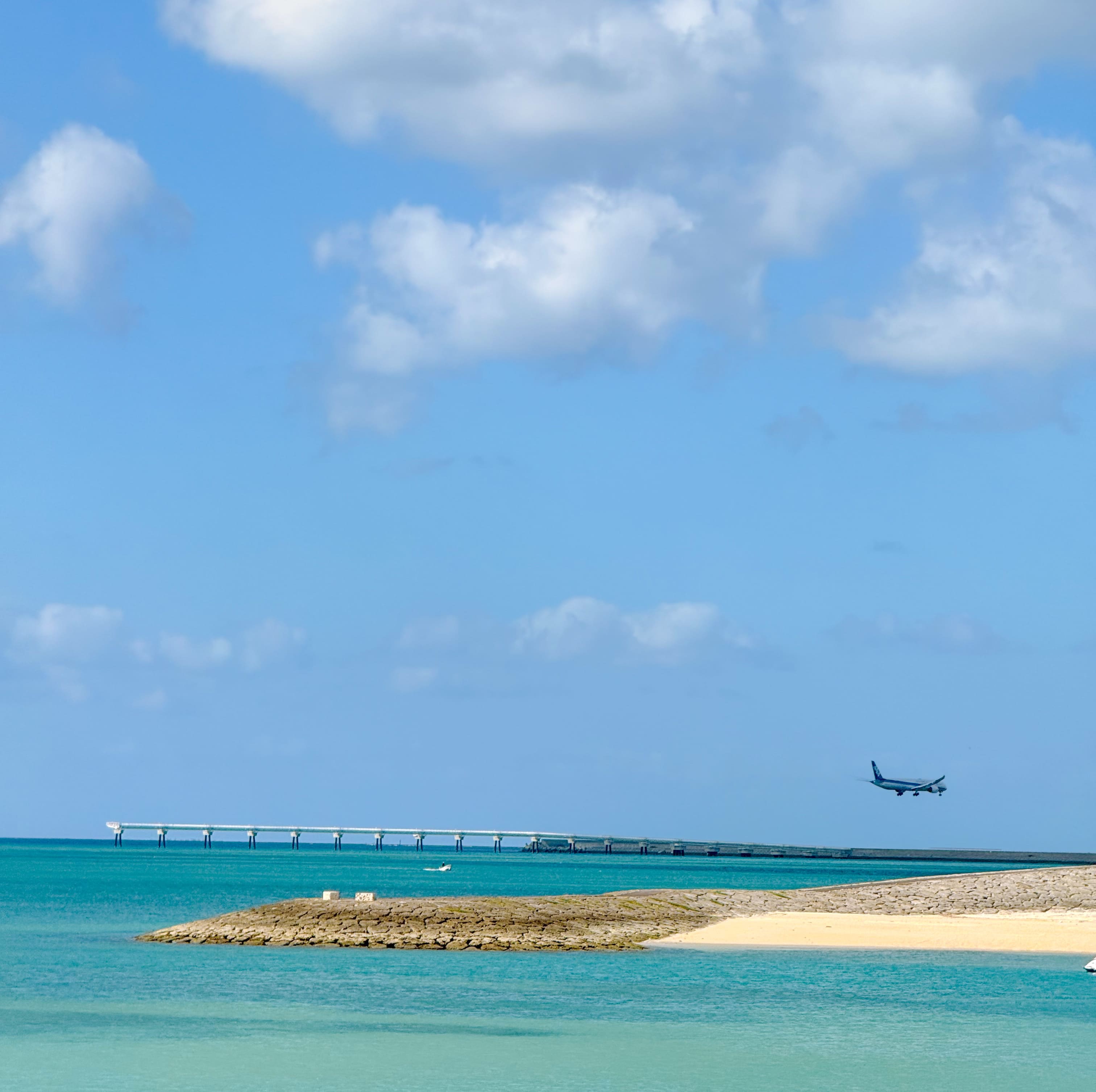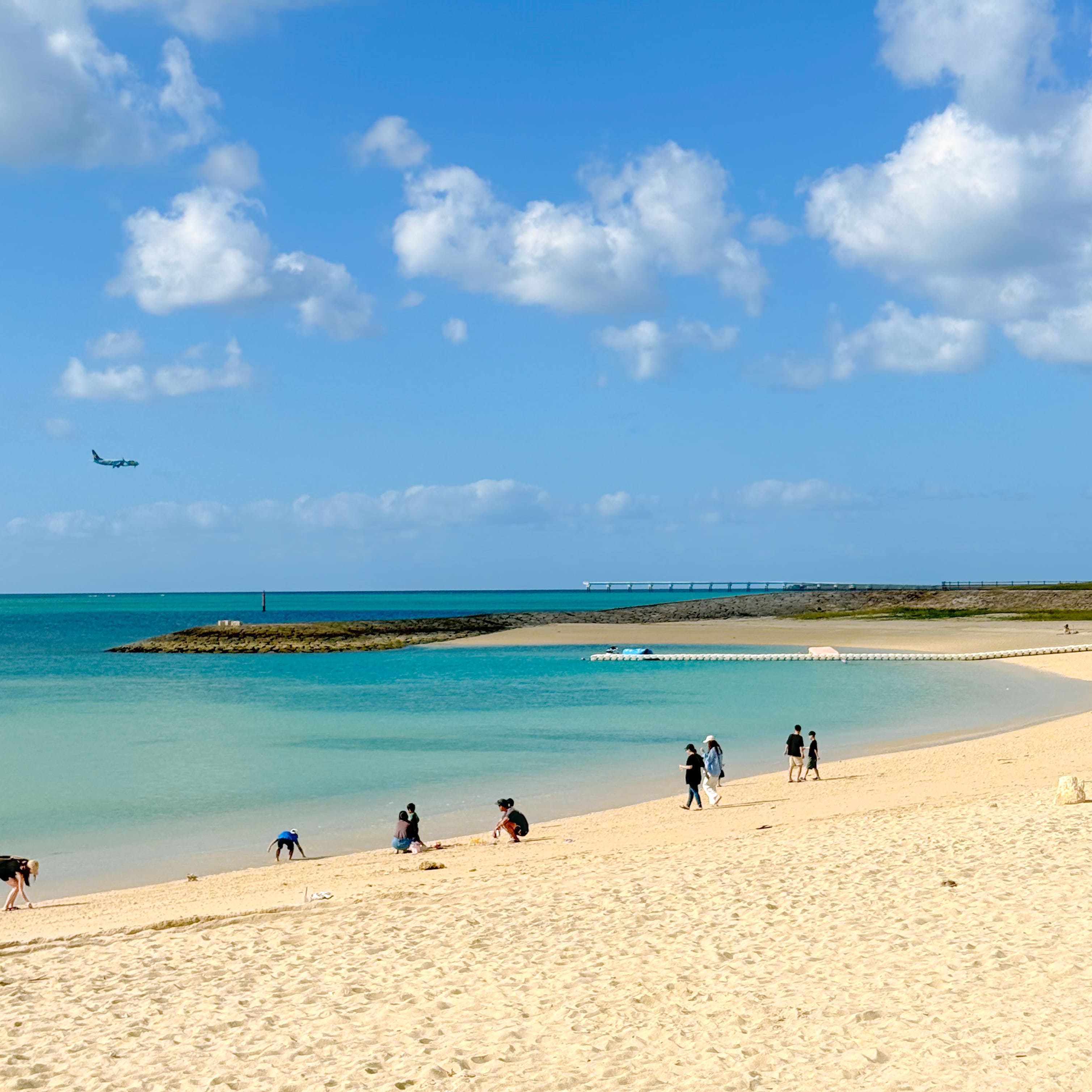 ヤシの木ロードからすぐの所にある、美らSUNビーチへ。 11月からは駐車料金が1時間100円で、年中24時間停めても500円。良心的ですね。 既に遊泳時期は終わっていますが、BBQをしたり砂浜で遊んでいる人がたくさんいました。 那覇空港が目の前なので飛行機の着陸シーンもかなり近くで眺めることができます。