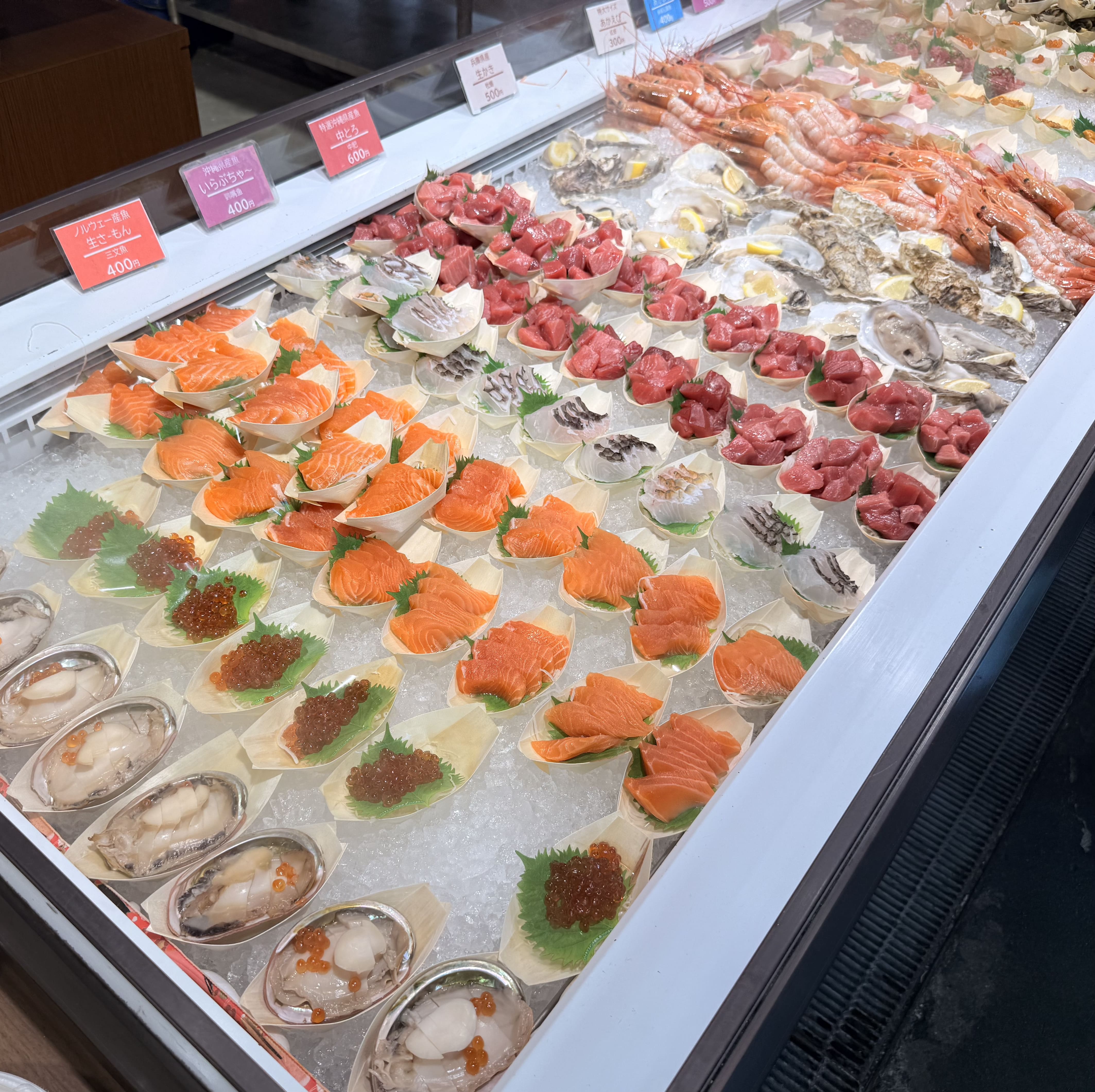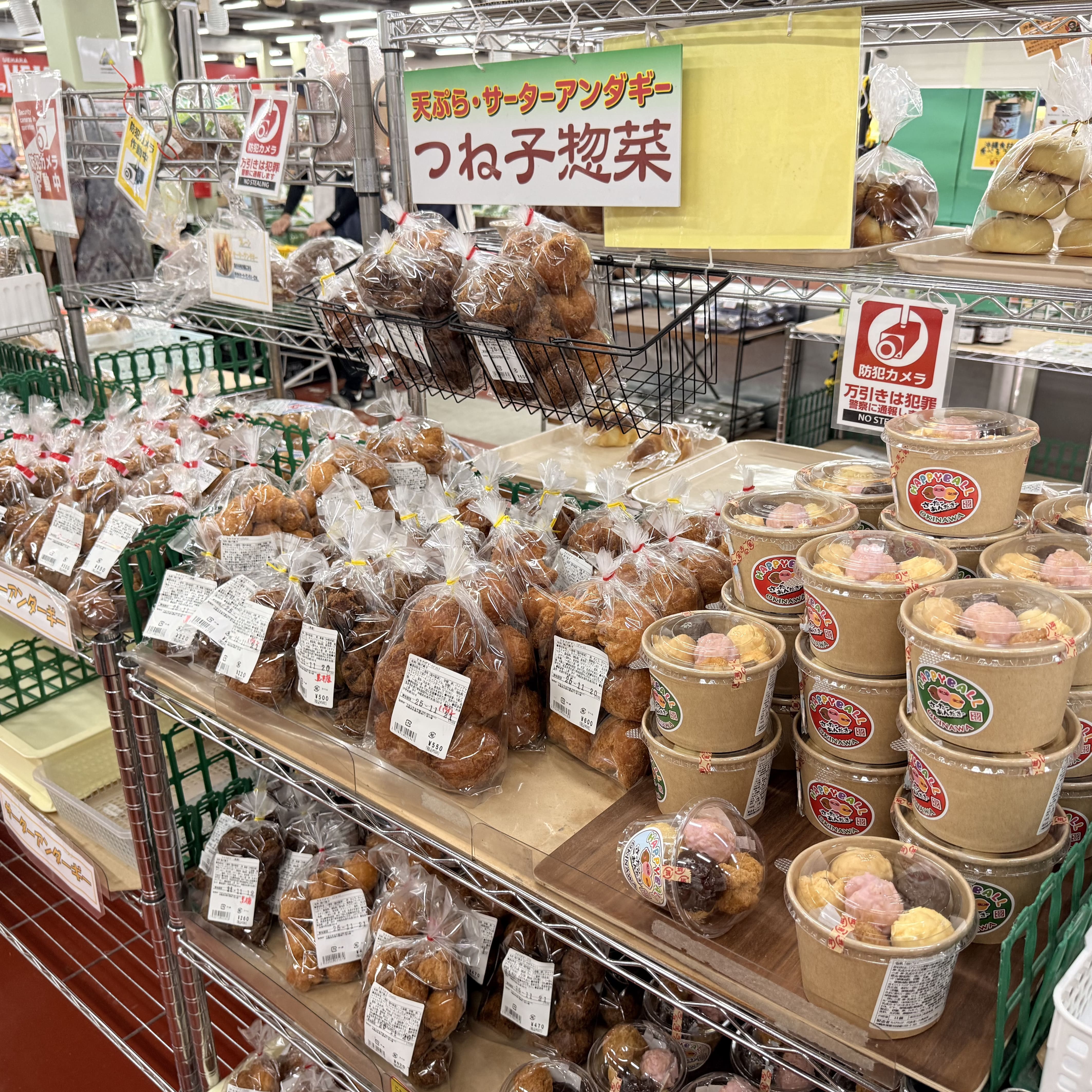 一般の人も利用できるローカルな市場で、新鮮なお刺身や海鮮串焼きがズラリ。 どれも美味しそうで目移りしてしまいます。 私はマグロ中トロ6貫と生サーモンづくし6貫を購入。どちらも脂が乗っていて最高! しかもマグロ中トロは500円。生サーモンは780円。コスパ良すぎませんか...? 一応18:00まで営業していますが、前日17:00頃に寄ったところほとんど商品もなくお店も閉まっていたので、14:00くらいまでに行くのがベストだと思います。 海鮮がメインですが焼きサバのおにぎりもあったので子供が食べるものにも困りませんでした。 隣のファーマーズマーケットでお土産や果物、サーターアンダギーなども購入できます。 ただし野菜や果物は島から持ち出し禁止の物もあるので要確認。 揚げ団子とサーターアンダギーを買って帰りました!