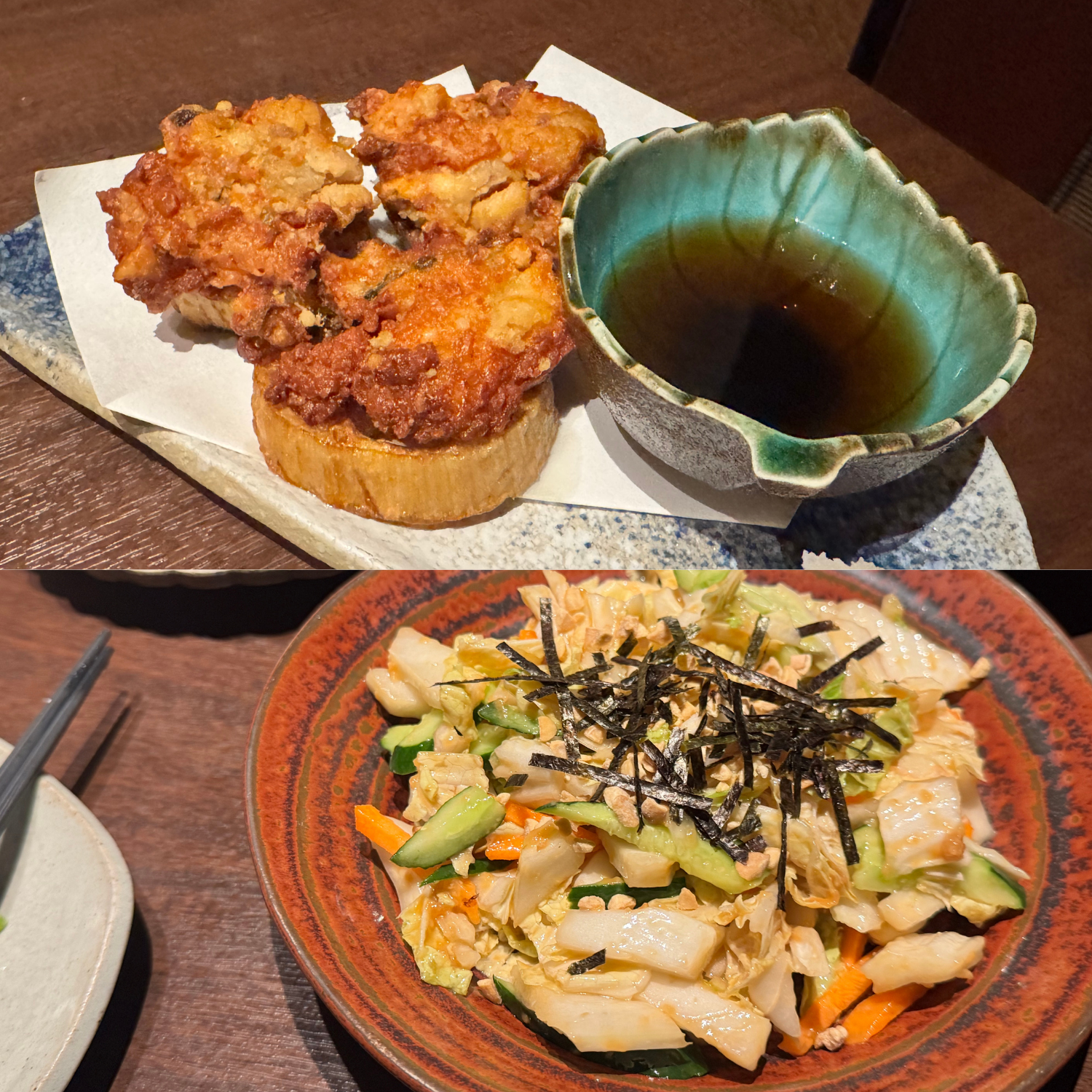 晚餐我們來到土浦車站附近的居酒屋「常陸之國 もんどころ」,主打茨城在地料理。我們淺嚐了幾道特色菜,像是納豆蔬菜沙拉、炸安康魚、納豆蓮藕天婦羅,每一道都充滿地方風味。連看似普通的炒麵,醬汁和豬肉也意外地好吃!店內也有許多茨城產的地酒可以搭配餐點,從食材到酒都很有誠意,很推薦來這裡體驗一下。