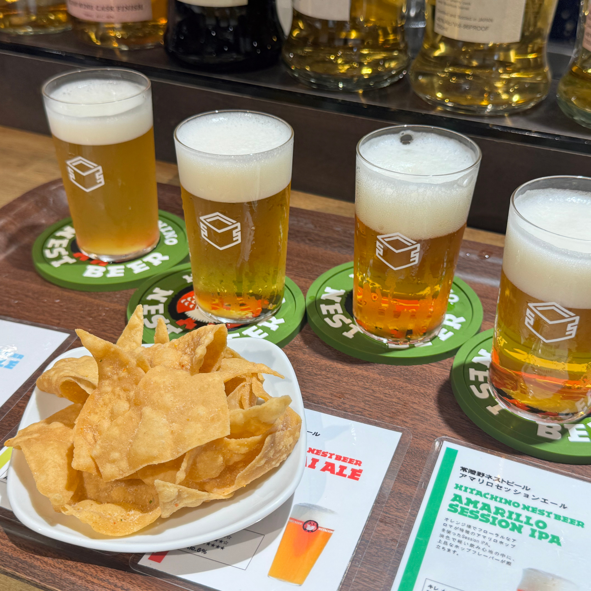 買伴手禮的第二站,當然不能錯過當地好酒!我們來到「佐藤酒店」,這是一家主打茨城地酒的體驗型專門店。店內除了販售來自約30家酒藏的在地酒,還設有站席可以現場試飲。這次我們體驗了常陸野釀造的啤酒試飲組合,還順道買了一瓶木內酒造所出品的威士忌。吃飽喝足、收穫滿滿,這趟土浦小旅行完美收尾!