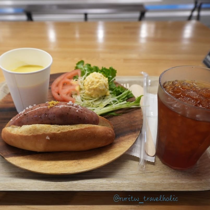 第二天早上的早餐是飯店與鄰近商店合作的餐點,我選擇了位於車站 2 樓的麵包店 COURNNE BAKERY 推出的有土浦在地食材做成的鹹香腸麵包套餐。早餐結束回到飯店,我們使用了思慕昔兌換券,換了水果思慕昔。水果思慕昔的製作方式很特別,工作人員會準備好原料,裝在大廳裡兩台我原本以為是裝飾的腳踏車上,接著讓我們像踩飛輪的方式踩 30 秒,一杯靠自己的腳力踩出來的思慕昔就完成了。