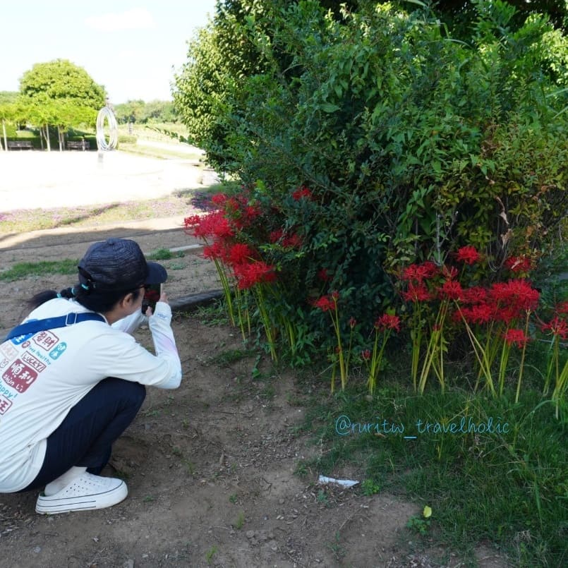 退房完我跟媽媽徒步去「霞浦綜合公園」,沿著河川散步拍照,其實也差不多 40 分鐘就到了。霞浦公園最著名的地標是風車,搭配季節交替盛開的彼岸花,青綠的風車與豔紅的花朵,形成強烈色彩對比。就我的觀察,公園內春末有紫藤、盛夏有荷花、初秋有彼岸,每一個季節都有不同風情。值得一提的是,剛好附近的服務中心賣泡泡水,我買了泡泡水跟媽媽玩得不亦樂乎。