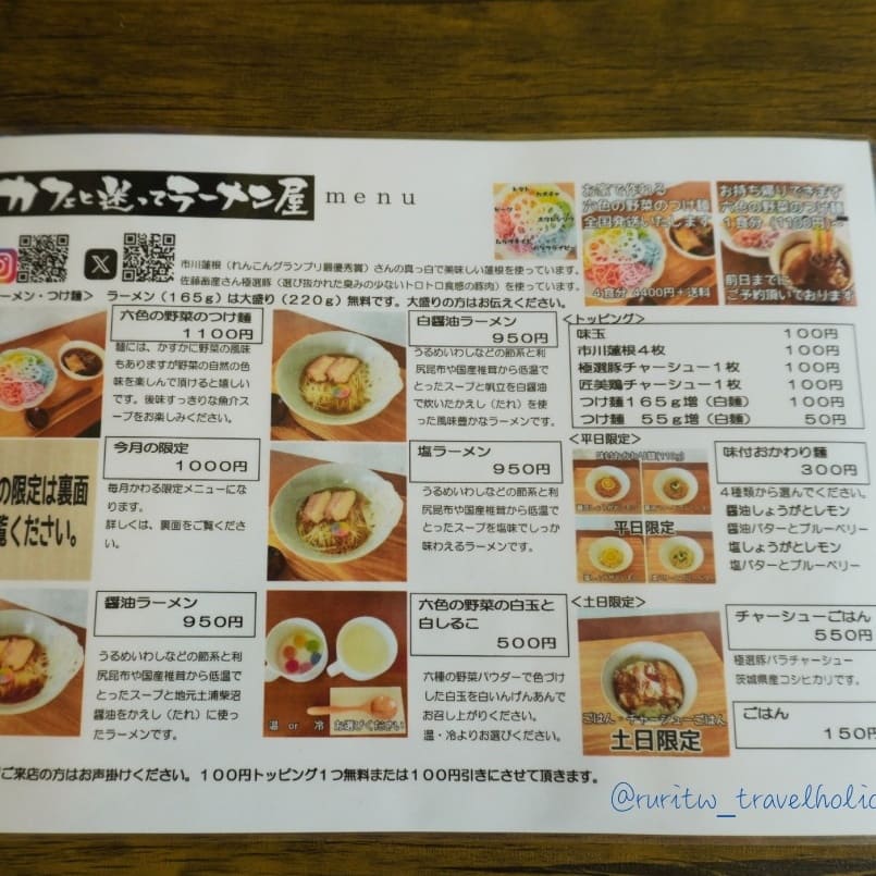 橫跨了霞浦公園的綠地,來到一間拉麵店吃午餐。這是一間很有特色的拉麵店,外面停放著一輛六色烤漆的金龜車。老闆對於色彩著迷,生活用品舉凡汽車、單車,或是其他裝飾品,皆是六種顏色,店內更是擺放著色彩檢定的證書。每個月會推出限定菜單,不過我覺得最有特色的還是用六種食材做成的六色沾麵,紅色甜菜根、橙色番茄、黃色南瓜、綠色菠菜、藍色蝶豆花,是對身體很好的蔬菜。老闆夫婦都是很親切的人,知道我們從臺灣來,說他們很喜歡臺灣也有去臺灣騎腳踏車。