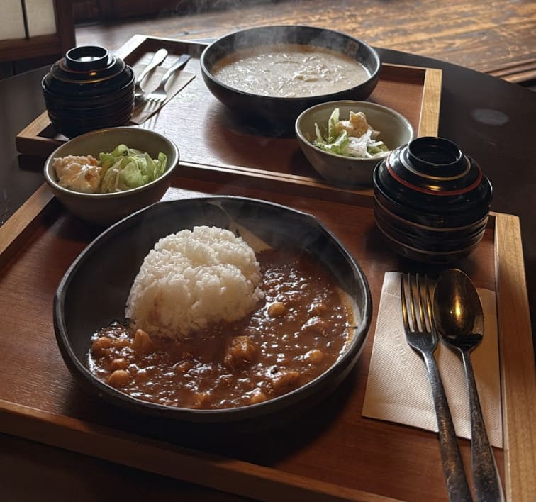 就位在亀城公園對面的老宅咖啡館「城藤茶店」,由昭和時期的木造住宅改建而成,散發著懷舊又溫馨的氣息。這次點了店內人氣定番的「原創咖哩」、「年糕鬆餅」,還有香氣濃郁的「起司燉飯」。咖哩使用土浦名產蓮藕和鷹嘴豆製成,微辣中帶有爽脆口感,燉飯奶香十足,份量剛好。甜點的年糕鬆餅外脆內Q,淋上店家特製醬汁再搭配冰淇淋一起享用,是地方媒體和節目都推薦的特色甜品。
