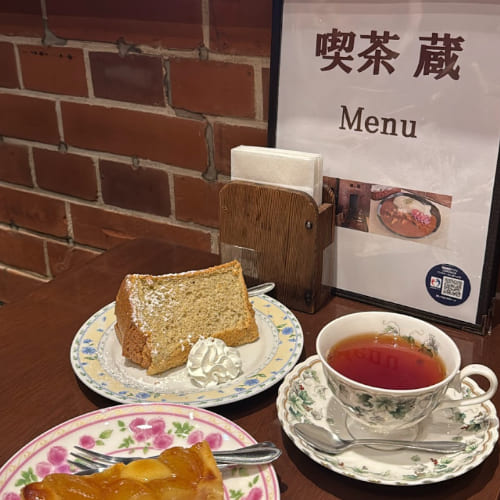 位於同一條街道的小巷內,還有一家充滿懷舊氣息的紅磚咖啡館「喫茶 蔵」,也是受當地居民和遊客歡迎的人氣咖啡廳。點了蘋果塔和熱紅茶,還很幸運地點到了剩最後一份的紅茶戚風蛋糕。店內的玻璃窗和建築設計,加上偏英式的餐點茶具及餐桌,整體氛圍比上一間更添一份莊嚴和優雅。很適合來這裡享受英式下午茶時光。