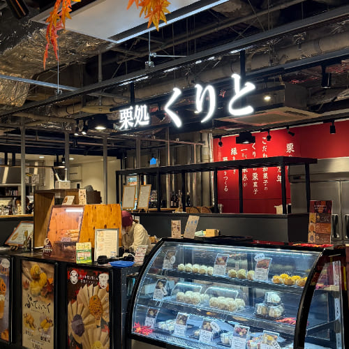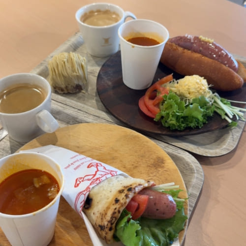 在「PLAYatré TSUCHIURA」裡,使用飯店提供的早餐券,在「Couronne Bakery」享用了熱狗堡與捲餅。熱狗多汁、麵包和捲餅鬆軟可口,其他麵包看起來也都超好吃。但我們決定試試旁邊的「栗処 くりと」細絲蒙布朗,除了栗子口味外,還有地瓜與季節限定的南瓜口味,有些甚至可以試吃,我們試吃完後立刻就買了。土浦在地老字號的和菓子店「志ち乃」也能在這裡就買到,是土浦人氣極高的銅鑼燒名店。