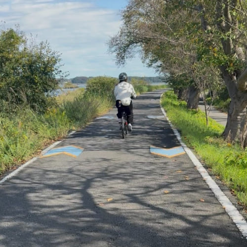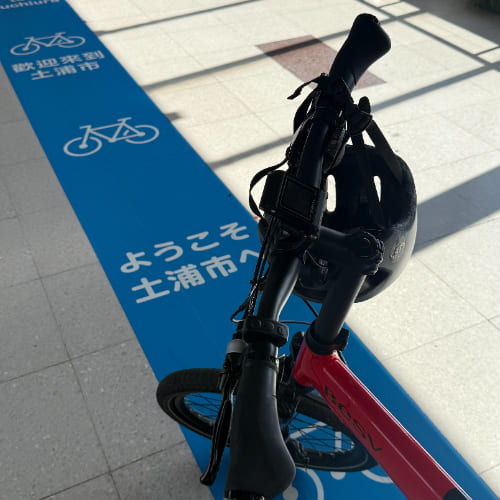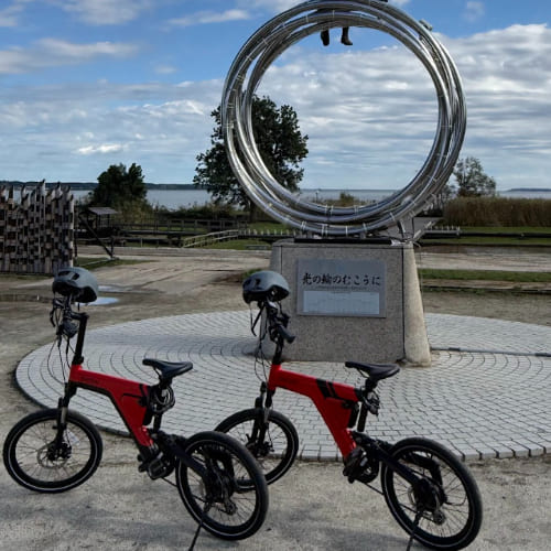 推薦有機會來土浦的話一定要體驗騎腳踏車!我們的第一站是「霞ヶ浦総合公園」。從飯店出發沿著湖邊騎行,微風迎面吹來,天氣晴朗,整段路都能欣賞到霞浦湖的開闊景色。公園內的荷蘭型風車前還有「光の輪のむこうに」雕塑,許多騎腳踏車經過的人都會特地停下來拍照打卡,將風車與湖景一起收進畫面中,是土浦最具代表性的景點之一。