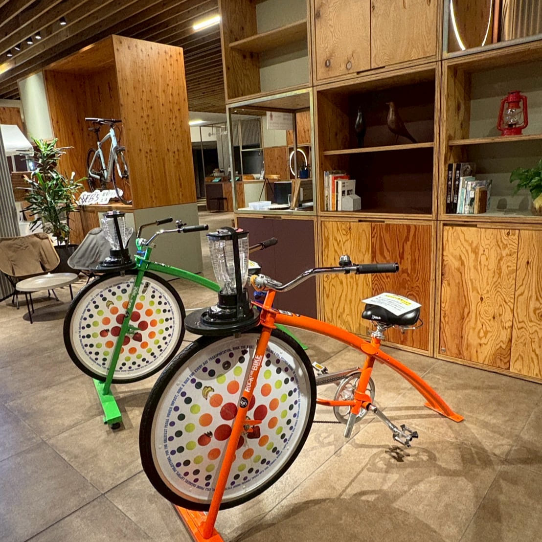 這裡真的很好玩,把騎車文化融入室內體驗。 我跟朋友選了 草莓 與 哈密瓜 口味,邊踩邊做奶昔,雖然只有三十秒但真的很累。喝不完可以外帶。 接著拿早餐券去 atre 換麵包,一張可換兩個自選麵包,或者直接感恩櫃檯點套餐~是超佛心的份量。