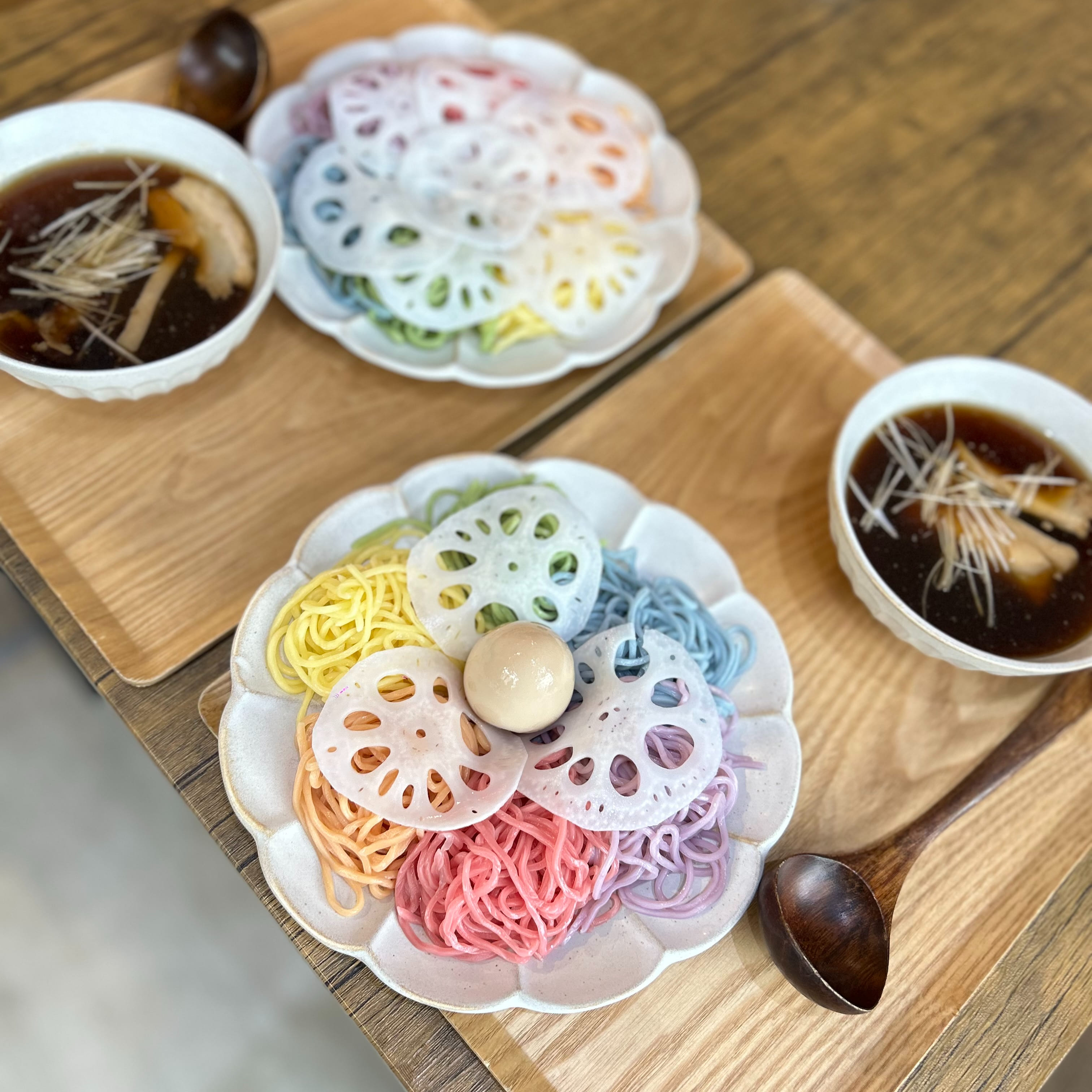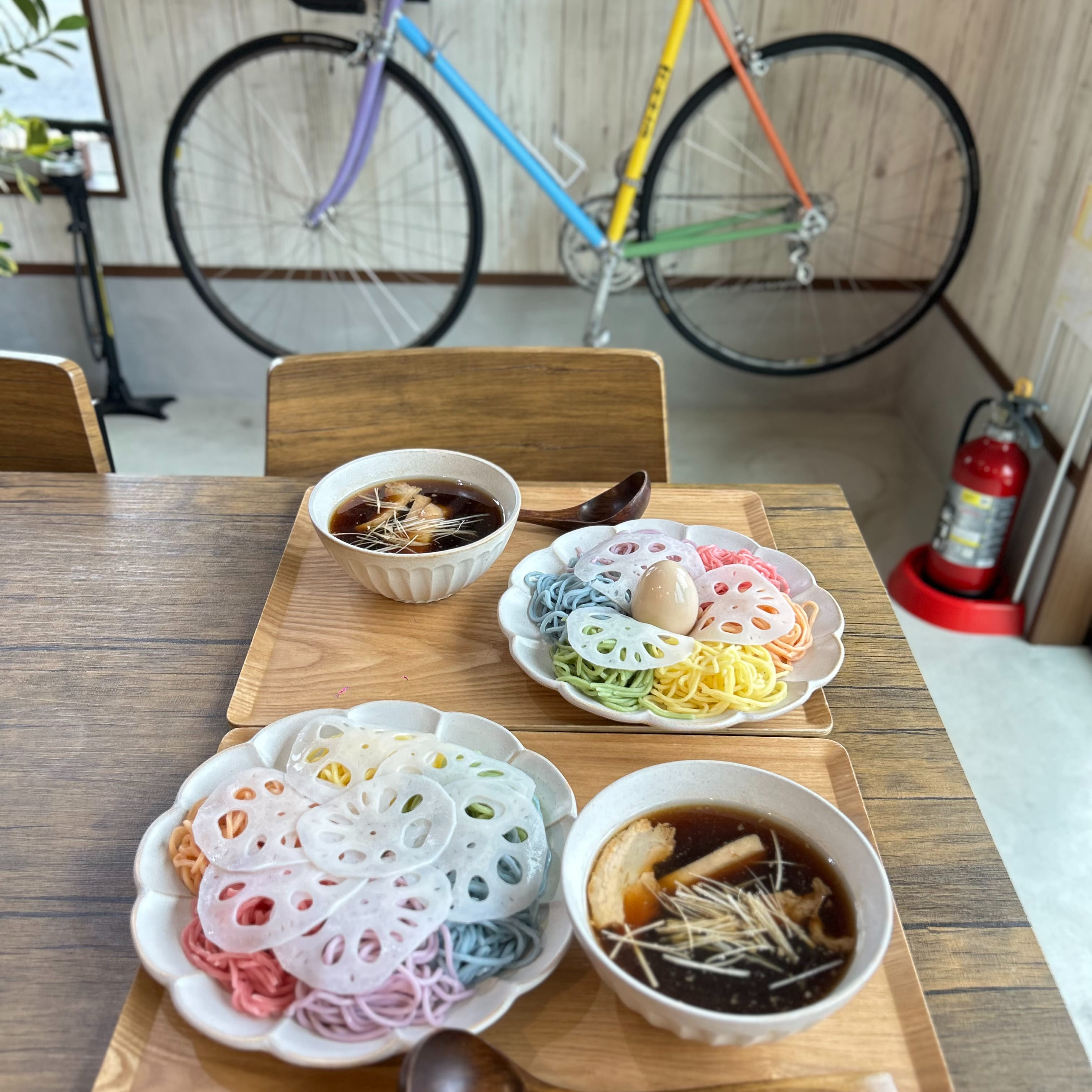 不知道要開咖啡廳還是拉麵店(? 店名就像老闆娘掙扎後的結果。只營業中午。 主打非常漂亮的 六彩沾麵,上面有三片蓮藕薄片,清爽得很像在吃藝術品。 外頭的小轎車跟店內的兩台公路車也都是五彩繽紛的模樣🌈 是很開朗的夫婦經營的可愛拉麵小店! 沾麵吃完,可以跟老闆娘說想加高湯!