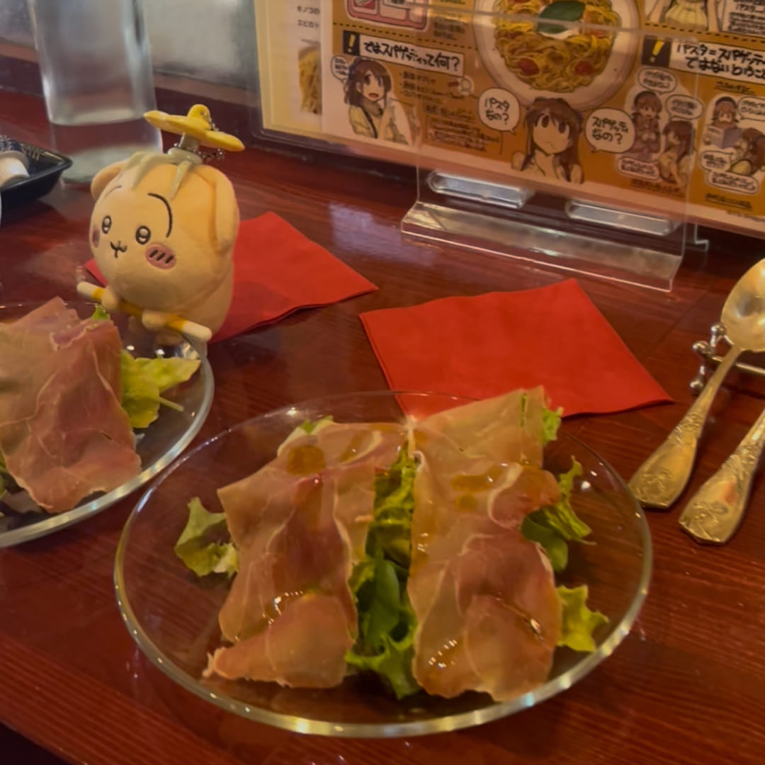 走路沒多久就到一間非常「低調卻強」的義式餐廳。 我點了 1150 円商業午餐套餐(生火腿沙拉+義大利麵或披薩+甜點),CP 值超高。 店裡天花板掛著一台公路車,完全是土浦這個「自行車之城」的小暗示。 老闆雖然沉默寡言,但人很暖,向他詢問附近有沒有推薦景點,他說:「可以去土浦城!」 櫃檯還貼滿獎狀,從 全馬完賽證書 到 香菇檢定資格,完全摸不透的反差魅力🤩