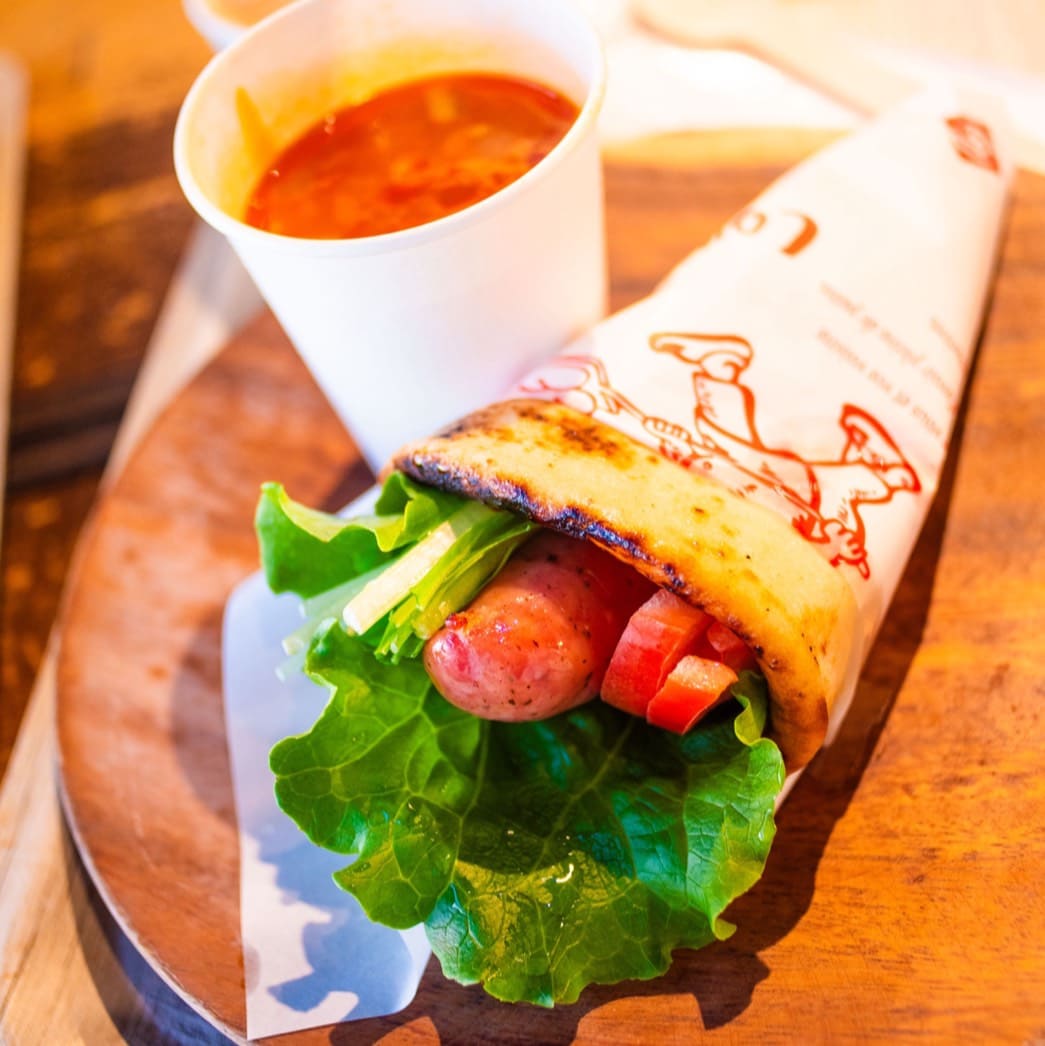 飯店的早餐和車站直結的商場 「プレイアトレ土浦」 合作,可以選擇Tullys咖啡店、麵包店或是假日限定的拉麵店。這次因為是平日的早餐就選了麵包店COURNNE BAKERY。只要出示飯店早餐券就可以兌換指定的麵包套餐,可以選擇在商場的公用空間享用。這次的早餐是多汁的香腸堡和捲餅,附餐的熱湯也超美味,很適合開啟美好的一天!