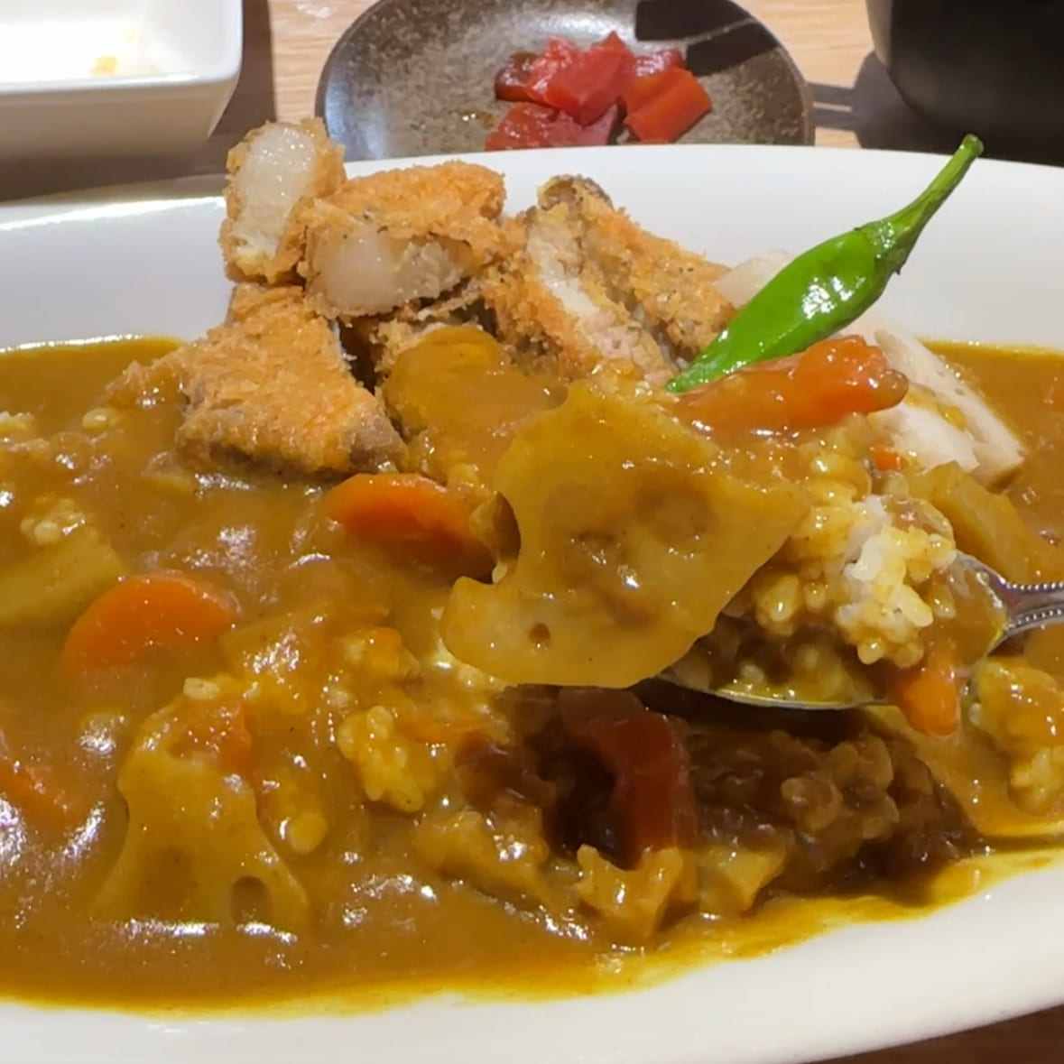 第一站就從車站東口開始,一走下樓梯就發現這家在地小食堂。店內裝潢帶著復古又可愛的風格,氣氛輕鬆又溫暖,讓人一坐下就很放鬆。這裡最有名的是蓮藕咖喱,上面還搭配了香酥多汁的炸豬排,口感豐富又超有滿足感,真的名不虛傳。而且還有特色蓮藕燒賣!可惜吃不了那麼多…就沒有點了,店家們也非常親切好客,讓人感受到滿滿的人情味。到了晚上,這裡還會變成酒吧,白天與夜晚完全不同的樣貌,也讓人忍不住想再訪一次!