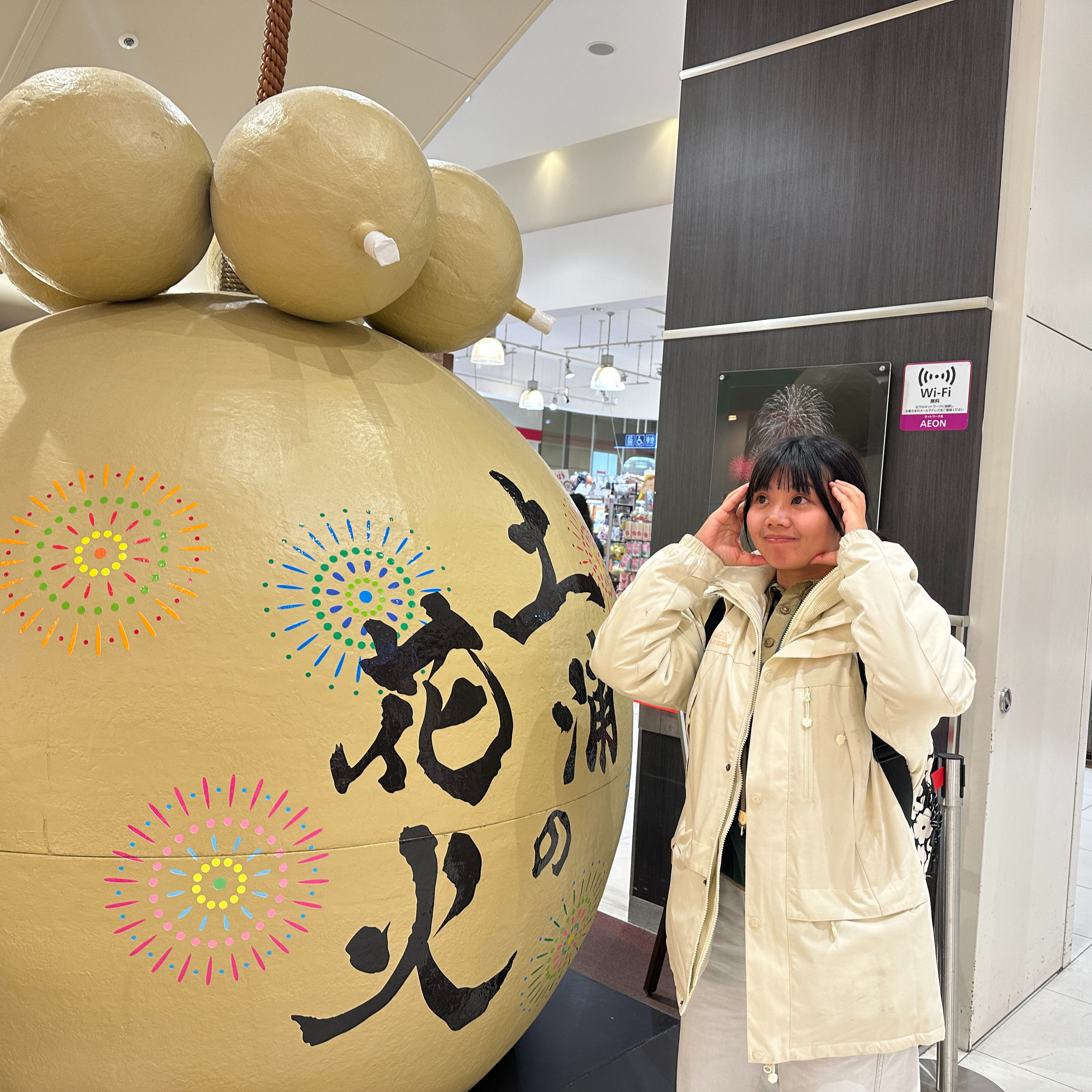 之後前往 AENO 購物商城。聽說這類型的購物商場多半只會出現在日本的郊區,在這裡買了一些伴手禮,還看到了土浦煙火的原型,沒想到實體竟然這麼大,真的令人相當震撼!商場內也能找到許多土浦在地美食,像是地瓜相關商品、蓮藕製品等,充滿地方特色。能在這樣的地方為土浦之旅畫下句點,真的很棒!